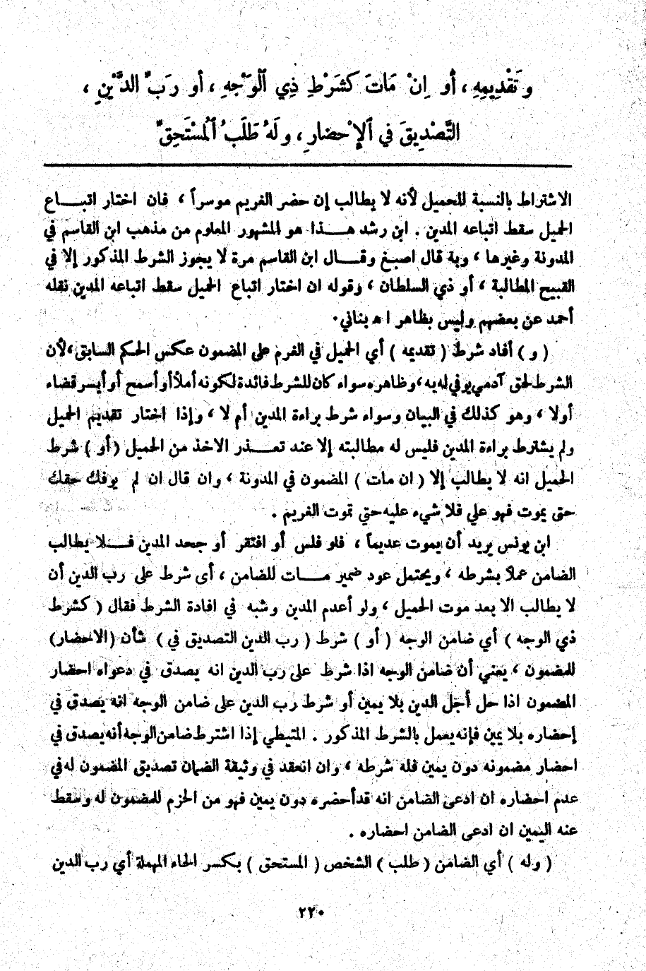 ـــــــــــــــــــــــــــــQالِاشْتِرَاطِ بِالنِّسْبَةِ لِلْحَمِيلِ لِأَنَّهُ لَا يُطَالَبُ إنْ حَضَرَ الْغَرِيمُ مُوسِرًا، فَإِنْ اخْتَارَ إتْبَاعَ الْحَمِيلِ سَقَطَ إتْبَاعُهُ الْمَدِينَ. ابْنُ رُشْدٍ هَذَا هُوَ الْمَشْهُورُ الْمَعْلُومُ مِنْ مَذْهَبِ ابْنِ الْقَاسِمِ فِي الْمُدَوَّنَةِ وَغَيْرِهَا، وَبِهِ قَالَ أَصْبَغُ وَقَالَ ابْنُ الْقَاسِمِ مَرَّةً لَا يَجُوزُ الشَّرْطُ الْمَذْكُورُ إلَّا فِي الْقَبِيحِ الْمُطَالَبَةِ، أَوْ ذِي السُّلْطَانِ، وَقَوْلُهُ إنْ اخْتَارَ إتْبَاعَ الْحَمِيلِ سَقَطَ إتْبَاعُهُ الْمَدِينَ نَقَلَهُ أَحْمَدُ عَنْ بَعْضِهِمْ وَلَيْسَ بِظَاهِرٍ اهـ بُنَانِيٌّ.