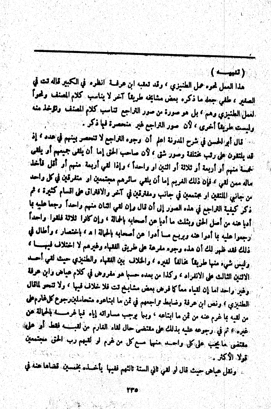 ـــــــــــــــــــــــــــــQ (تَنْبِيهٌ) هَذَا الْعَمَلُ نَحْوُهُ عَمِلَ الطُّنَيْزِيُّ، وَقَدْ تَعَقَّبَهُ ابْنُ عَرَفَةَ اُنْظُرْهُ فِي الْكَبِيرِ قَالَهُ تت فِي الصَّغِيرِ طفي جَعْلُهُ مَا ذَكَرَهُ بَعْضُ مَشَايِخِهِ طَرِيقًا آخَرَ لَا يُنَاسِبُ كَلَامَ الْمُصَنِّفِ وَنَحْوًا لِعَمَلِ الطُّنَيْزِيِّ وَهُمْ، بَلْ هُوَ صُورَةٌ مِنْ صُوَرِ التَّرَاجُعِ تُنَاسِبُ كَلَامَ الْمُصَنِّفِ وَتُؤْخَذُ مِنْهُ وَلَيْسَتْ طَرِيقًا أُخْرَى، لِأَنَّ صُوَرَ التَّرَاجُعِ غَيْرُ مُنْحَصِرَةٍ فِيمَا ذَكَرَ.