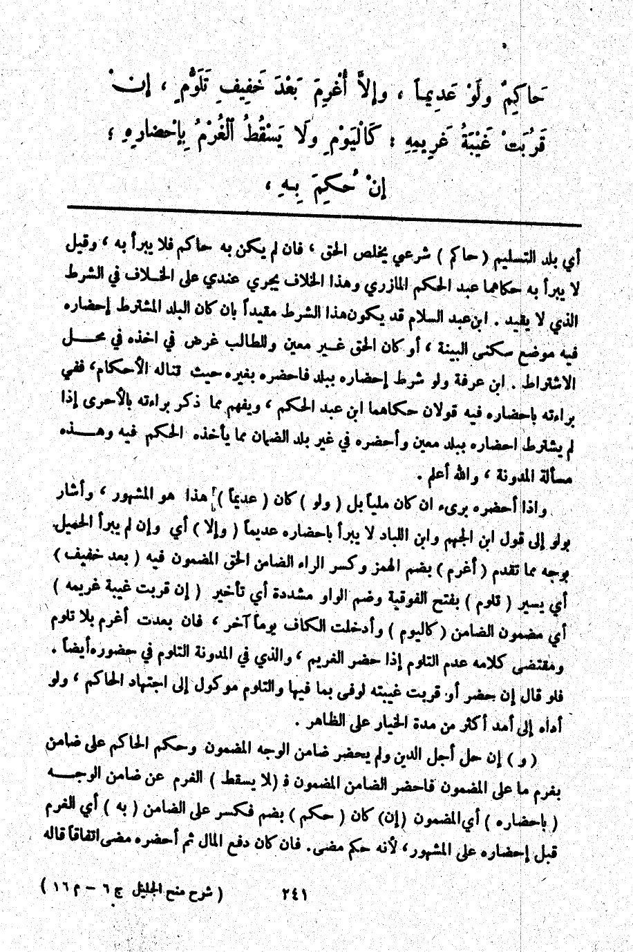 ـــــــــــــــــــــــــــــQأَيْ بَلَدِ التَّسْلِيمِ (حَاكِمٌ) شَرْعِيٌّ يُخَلِّصُ الْحَقَّ، فَإِنْ لَمْ يَكُنْ بِهِ حَاكِمٌ فَلَا يَبْرَأُ بِهِ، وَقِيلَ لَا يَبْرَأُ بِهِ حَكَاهُمَا عَبْدُ الْحَكَمِ الْمَازِرِيُّ وَهَذَا الْخِلَافُ يَجْرِي عِنْدِي عَلَى الْخِلَافِ فِي الشَّرْطِ الَّذِي لَا يُقَيَّدُ. ابْنُ عَبْدِ السَّلَامِ قَدْ يَكُونُ هَذَا الشَّرْطُ مُقَيَّدًا بِأَنْ كَانَ الْبَلَدُ الْمُشْتَرَطُ إحْضَارُهُ فِيهِ مَوْضِعَ سُكْنَى الْبَيِّنَةِ، أَوْ كَانَ الْحَقُّ غَيْرَ مُعَيَّنٍ وَلِلطَّالِبِ غَرَضٌ فِي أَخْذِهِ فِي مَحَلِّ الِاشْتِرَاطِ. ابْنُ عَرَفَةَ وَلَوْ شَرَطَ إحْضَارَهُ بِبَلَدٍ فَأَحْضَرَهُ بِغَيْرِهِ حَيْثُ تَنَالُهُ الْأَحْكَامُ، فَفِي بَرَاءَتِهِ بِإِحْضَارِهِ فِيهِ قَوْلَانِ حَكَاهُمَا ابْنُ عَبْدِ الْحَكَمِ، وَيُفْهَمُ مِمَّا ذَكَرَ بَرَاءَتَهُ بِالْأَحْرَى إذَا لَمْ يَشْتَرِطْ إحْضَارَهُ بِبَلَدٍ مُعَيَّنٍ وَأَحْضَرَهُ فِي غَيْرِ بَلَدِ الضَّمَانِ مِمَّا يَأْخُذُهُ الْحُكْمُ فِيهِ وَهَذِهِ مَسْأَلَةُ الْمُدَوَّنَةِ، وَاَللَّهُ أَعْلَمُ.