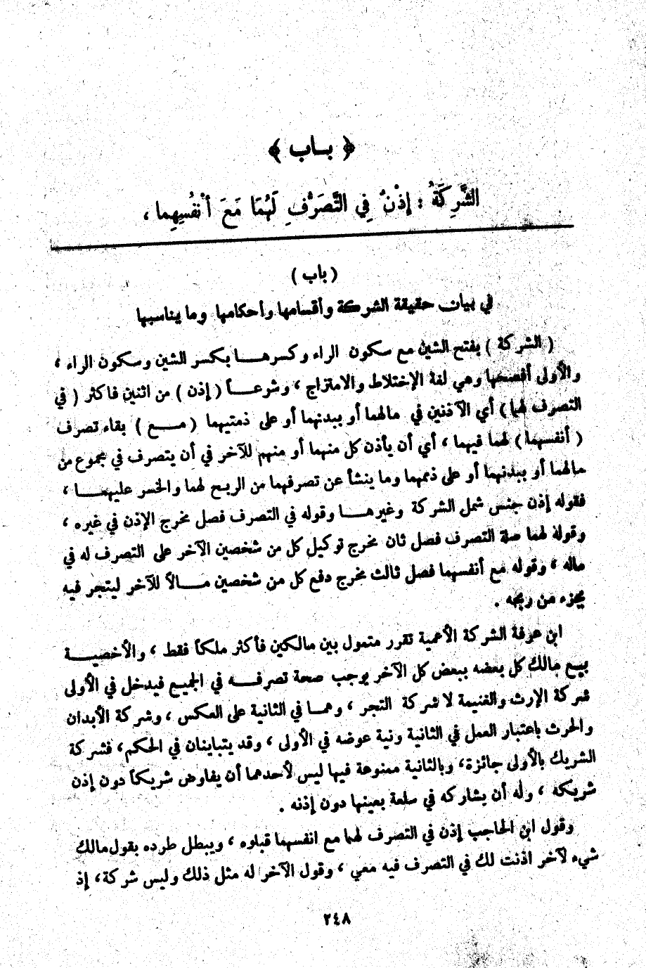(بَابٌ) الشَّرِكَةُ: إذْنٌ فِي التَّصَرُّفِ لَهُمَا مَعَ أَنْفُسِهِمَا