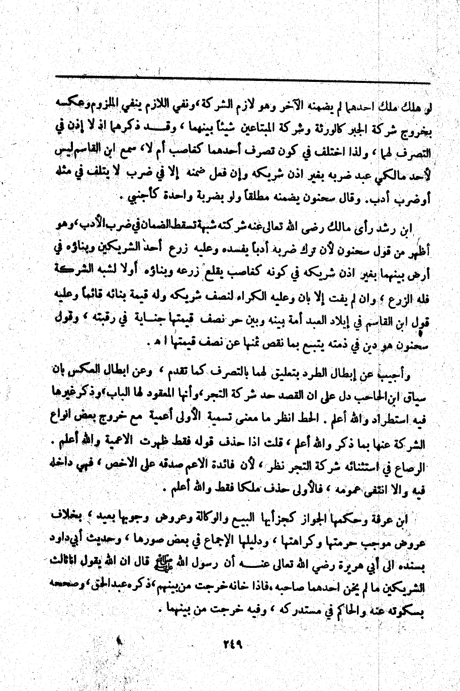 ابْنُ رُشْدٍ رَأْيُ مَالِكٍ - رَضِيَ اللَّهُ تَعَالَى عَنْهُ - شَرِكَتُهُ شُبْهَةٌ تُسْقِطُ الضَّمَانَ فِي ضَرْبِ الْأَدَبِ، وَهُوَ أَظْهَرُ مِنْ قَوْلِ سَحْنُونٍ لِأَنَّ تَرْكَ ضَرْبِهِ أَدَبًا يُفْسِدُهُ وَعَلَيْهِ زَرْعُ أَحَدِ الشَّرِيكَيْنِ وَبِنَاؤُهُ فِي أَرْضٍ بَيْنَهُمَا بِغَيْرِ إذْنِ شَرِيكِهِ فِي كَوْنِهِ كَغَاصِبٍ يُقْلَعُ زَرْعُهُ وَبِنَاؤُهُ أَوْ لَا لِشَبَهِ الشَّرِكَةِ فَلَهُ الزَّرْعُ، وَإِنْ لَمْ يُفْتِ إلَّا بَانٍ وَعَلَيْهِ الْكِرَاءُ لِنِصْفِ شَرِيكِهِ وَلَهُ قِيمَةُ بِنَائِهِ قَائِمًا وَعَلَيْهِ قَوْلُ ابْنِ الْقَاسِمِ فِي إيلَادِ الْعَبْدِ أَمَةً بَيْنَهُ وَبَيْنَ حُرٍّ نِصْفُ قِيمَتِهَا جِنَايَةً فِي رَقَبَتِهِ، وَقَوْلُ سَحْنُونٍ هُوَ دَيْنٌ فِي ذِمَّتِهِ يُتْبَعُ بِمَا نَقَصَ ثَمَنُهَا عَنْ نِصْفِ قِيمَتِهَا اهـ.