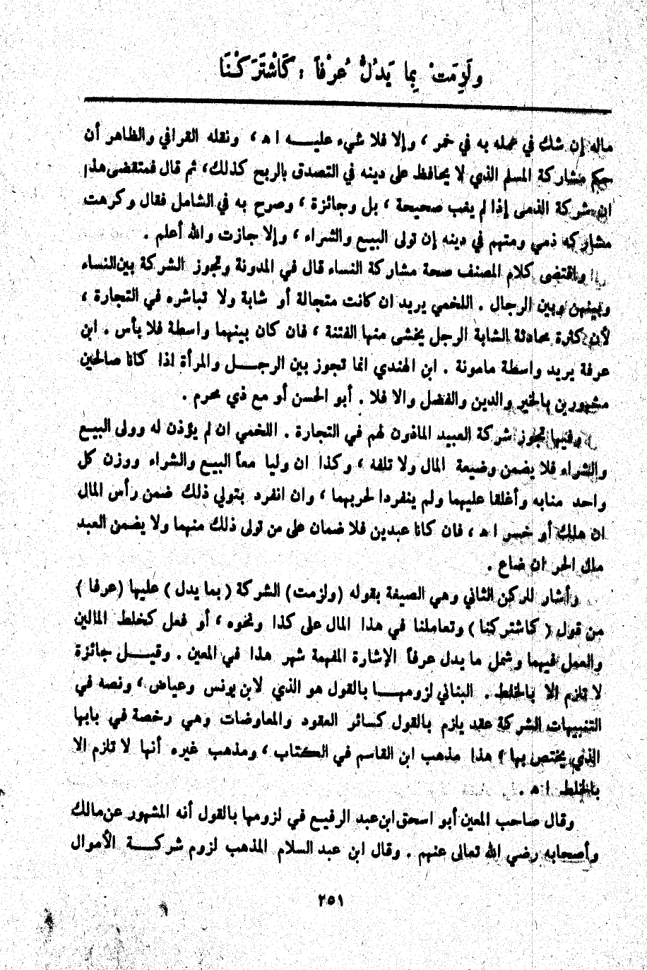ـــــــــــــــــــــــــــــQمَالِهِ إنْ شَكَّ فِي عَمَلِهِ بِهِ فِي خَمْرٍ، وَإِلَّا فَلَا شَيْءَ عَلَيْهِ. اهـ. وَنَقَلَهُ الْقَرَافِيُّ وَالظَّاهِرُ أَنَّ حُكْمَ مُشَارَكَةِ الْمُسْلِمِ الَّذِي لَا يُحَافِظُ عَلَى دِينِهِ فِي التَّصَدُّقِ بِالرِّبْحِ كَذَلِكَ، ثُمَّ قَالَ فَمُقْتَضَى هَذَا أَنَّ شَرِكَةَ الذِّمِّيِّ إذَا لَمْ يَغِبْ صَحِيحَةٌ، بَلْ وَجَائِزَةٌ، وَصَرَّحَ بِهِ فِي الشَّامِلِ فَقَالَ وَكُرِهَتْ مُشَارَكَةُ ذِمِّيٍّ وَمُتَّهَمٍ فِي دِينِهِ إنْ تَوَلَّى الْبَيْعَ وَالشِّرَاءَ، وَإِلَّا جَازَتْ وَاَللَّهُ أَعْلَمُ.