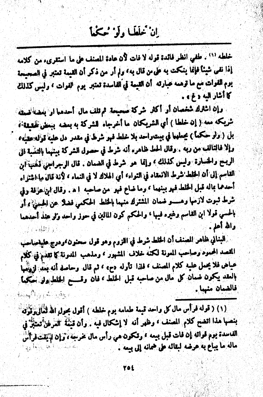وَإِنْ اشْتَرَكَ شَخْصَانِ أَوْ أَكْثَرُ شَرِكَةً صَحِيحَةً ثُمَّ تَلِفَ مَالُ أَحَدِهِمَا أَوْ بَعْضُهُ ضَمِنَهُ شَرِيكُهُ مَعَهُ (إنْ خَلَطَا) أَيْ الشَّرِيكَانِ مَا أَخْرَجَاهُ لِلشَّرِكَةِ بِهِ بَعْضَهُ بِبَعْضٍ حَقِيقَةً، بَلْ (وَلَوْ حُكْمًا) بِجَعْلِهِمَا فِي بَيْتٍ وَاحِدٍ بِلَا خَلْطٍ فَهُوَ شَرْطٌ فِي مُقَدَّرٍ دَلَّ عَلَيْهِ قَوْلُهُ عَقِبَهُ، وَإِلَّا فَالتَّالِفُ مِنْ رَبِّهِ. وَقَالَ الْحَطّ ظَاهِرُهُ أَنَّهُ شَرْطٌ فِي حُصُولِ الشَّرِكَةِ بَيْنَهُمَا بِالنِّسْبَةِ إلَى الرِّبْحِ وَالْخَسَارَةِ وَلَيْسَ كَذَلِكَ، وَإِنَّمَا هُوَ شَرْطٌ فِي الضَّمَانِ. قَالَ الرَّجْرَاجِيُّ ذَهَبَ ابْنُ الْقَاسِمِ إلَى أَنَّ الْخَلْطَ شَرْطُ الِانْعِقَادِ فِي التَّوَاءِ، أَيْ الْهَلَاكِ لَا فِي النَّمَاءِ لِأَنَّهُ قَالَ مَا اشْتَرَاهُ أَحَدُهُمَا بِمَالِهِ قَبْلَ الْخَلْطِ فَهُوَ بَيْنَهُمَا، وَمَا ضَاعَ فَهُوَ مِنْ صَاحِبِهِ اهـ. وَقَالَ ابْنُ عَرَفَةَ وَفِي شَرْطِ ثُبُوتِ لَازِمِهَا وَهُوَ ضَمَانُ الْمُشْتَرَكِ مِنْهُمَا بِالْخَلْطِ الْحُكْمِيِّ فَضْلًا عَنْ الْحِسِّيِّ، أَوْ بِالْحِسِّيِّ قَوْلَا ابْنِ الْقَاسِمِ وَغَيْرِهِ فِيهَا، وَالْحُكْمُ كَوْنُ الْمَالَيْنِ فِي حَوْزِ وَاحِدٍ وَلَوْ عِنْدَ أَحَدِهِمَا وَاَللَّهُ أَعْلَمُ.