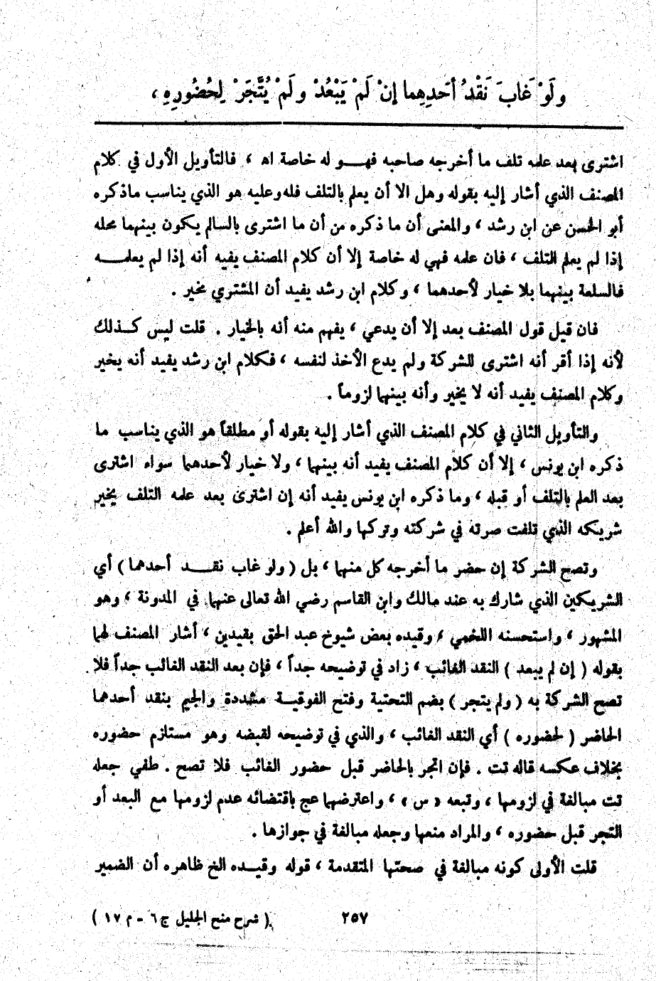 ـــــــــــــــــــــــــــــQاشْتَرَى بَعْدَ عِلْمِهِ تَلَفَ مَا أَخْرَجَهُ صَاحِبُهُ فَهُوَ لَهُ خَاصَّةً. اهـ. فَالتَّأْوِيلُ الْأَوَّلُ فِي كَلَامِ الْمُصَنِّفِ الَّذِي أَشَارَ إلَيْهِ بِقَوْلِهِ وَهَلْ إلَّا أَنْ يَعْلَمَ بِالتَّلَفِ فَلَهُ وَعَلَيْهِ هُوَ الَّذِي يُنَاسِبُ مَا ذَكَرَهُ أَبُو الْحَسَنِ عَنْ ابْنِ رُشْدٍ، وَالْمَعْنَى أَنَّ مَا ذَكَرَهُ مِنْ أَنَّ مَا اشْتَرَى بِالسَّالِمِ يَكُونُ بَيْنَهُمَا مَحِلُّهُ إذَا لَمْ يَعْلَمْ التَّلَفَ، فَإِنْ عَلِمَهُ فَهِيَ لَهُ خَاصَّةً إلَّا أَنَّ كَلَامَ الْمُصَنِّفِ يُفِيدُ أَنَّهُ إذَا لَمْ يَعْلَمْهُ فَالسِّلْعَةُ بَيْنَهُمَا بِلَا خِيَارٍ لِأَحَدِهِمَا، وَكَلَامُ ابْنِ رُشْدٍ يُفِيدُ أَنَّ الْمُشْتَرِيَ مُخَيَّرٌ.