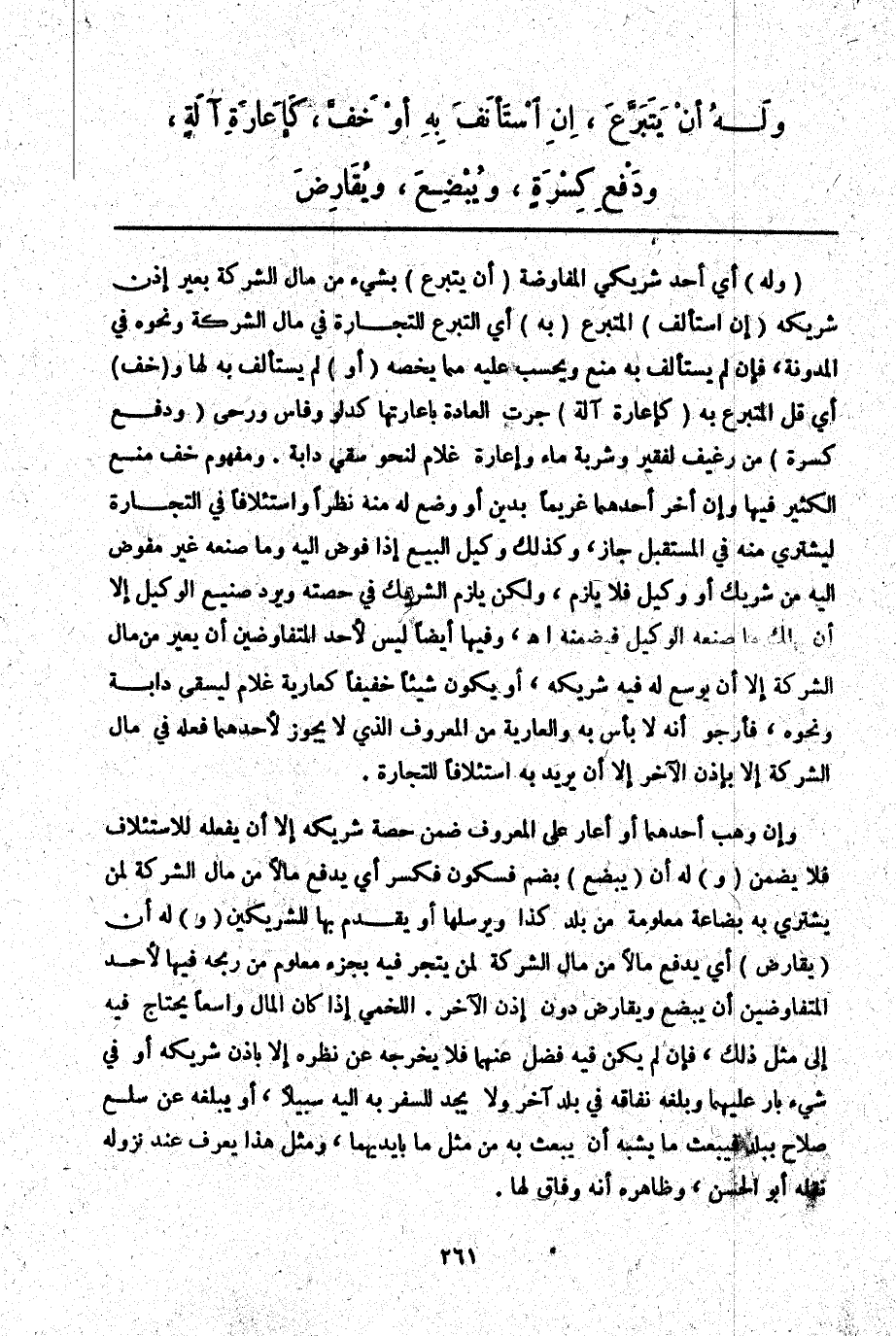 ـــــــــــــــــــــــــــــQ (وَلَهُ) أَيْ أَحَدُ شَرِيكَيْ الْمُفَاوَضَةِ (أَنْ يَتَبَرَّعَ) بِشَيْءٍ مِنْ مَالِ الشَّرِكَةِ بِغَيْرِ إذْنِ شَرِيكِهِ (إنْ اسْتَأْلَفَ) الْمُتَبَرِّعُ (بِهِ) أَيْ التَّبَرُّعِ لِلتِّجَارَةِ فِي مَالِ الشَّرِكَةِ وَنَحْوِهِ فِي الْمُدَوَّنَةِ، فَإِنْ لَمْ يَسْتَأْلِفْ بِهِ مُنِعَ وَيُحْسَبُ عَلَيْهِ مِمَّا يَخُصُّهُ (أَوْ) لَمْ يَسْتَأْلِفْ بِهِ لَهَا و (خَفَّ) أَيْ قَلَّ الْمُتَبَرَّعُ بِهِ (كَإِعَارَةِ آلَةٍ) جَرَتْ الْعَادَةُ بِإِعَارَتِهَا كَدَلْوٍ وَفَأْسٍ وَرَحًى (وَدَفْعِ كِسْرَةٍ) مِنْ رَغِيفٍ لِفَقِيرٍ وَشَرْبَةِ مَاءٍ وَإِعَارَةِ غُلَامٍ لِنَحْوِ سَقْيِ دَابَّةٍ. وَمَفْهُومُ خَفَّ مَنْعُ الْكَثِيرِ فِيهَا وَإِنْ أَخَّرَ أَحَدُهُمَا غَرِيمًا بِدَيْنٍ أَوْ وَضَعَ لَهُ مِنْهُ نَظَرًا وَاسْتِئْلَافًا فِي التِّجَارَةِ لِيَشْتَرِيَ مِنْهُ فِي الْمُسْتَقْبَلِ جَازَ، وَكَذَلِكَ وَكِيلُ الْبَيْعِ إذَا فَوَّضَ إلَيْهِ وَمَا صَنَعَهُ غَيْرُ مُفَوَّضٍ إلَيْهِ مِنْ شَرِيكٍ أَوْ وَكِيلٍ فَلَا يَلْزَمُ، وَلَكِنْ يَلْزَمُ الشَّرِيكَ فِي حِصَّتِهِ وَيَرُدُّ صَنِيعَ الْوَكِيلِ إلَّا أَنْ يَهْلِكَ مَا صَنَعَهُ الْوَكِيلُ فَيَضْمَنُهُ. اهـ. وَفِيهَا أَيْضًا لَيْسَ لِأَحَدِ الْمُتَفَاوِضَيْنِ أَنْ يُعِيرَ مِنْ مَالِ الشَّرِكَةِ إلَّا أَنْ يُوسِعَ لَهُ فِيهِ شَرِيكُهُ، أَوْ يَكُونَ شَيْئًا خَفِيفًا كَعَارِيَّةِ غُلَامٍ لِيَسْقِيَ دَابَّةً وَنَحْوِهِ، فَأَرْجُو أَنَّهُ لَا بَأْسَ بِهِ وَالْعَارِيَّةُ مِنْ الْمَعْرُوفِ الَّذِي لَا يَجُوزُ لِأَحَدِهِمَا فِعْلُهُ فِي مَالِ الشَّرِكَةِ إلَّا بِإِذْنِ الْآخَرِ إلَّا أَنْ يُرِيدَ بِهِ اسْتِئْلَافًا لِلتِّجَارَةِ. وَإِنْ وَهَبَ أَحَدُهُمَا أَوْ أَعَارَ عَلَى الْمَعْرُوفِ ضَمِنَ حِصَّةَ شَرِيكِهِ إلَّا أَنْ يَفْعَلَهُ لِلِاسْتِئْلَافِ فَلَا يَضْمَنُ
