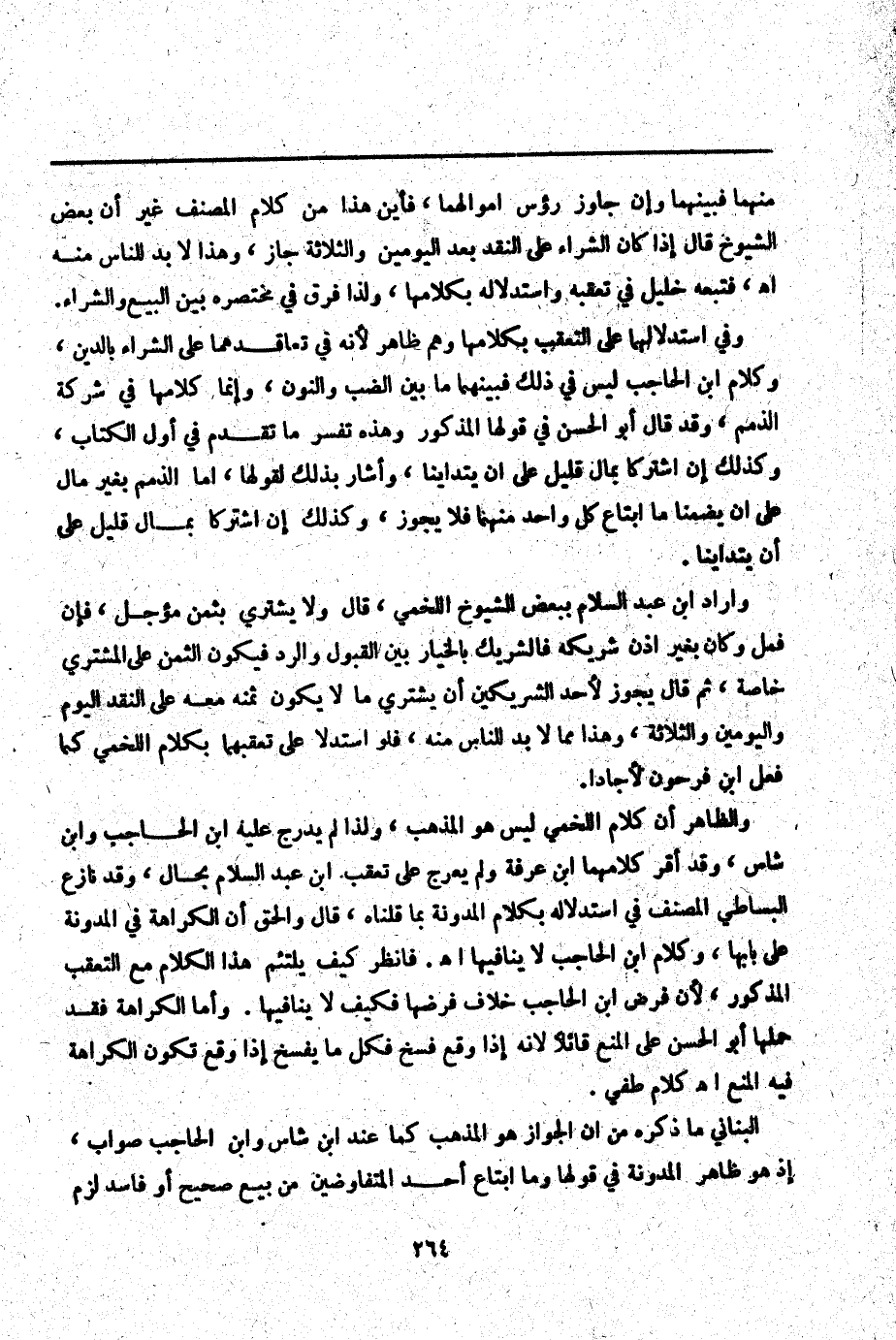وَأَرَادَ ابْنُ عَبْدِ السَّلَامِ بِبَعْضِ الشُّيُوخِ اللَّخْمِيَّ، قَالَ وَلَا يَشْتَرِي بِثَمَنٍ مُؤَجَّلٍ، فَإِنْ فَعَلَ وَكَانَ بِغَيْرِ إذْنِ شَرِيكِهِ فَالشَّرِيكُ بِالْخِيَارِ بَيْنَ الْقَبُولِ وَالرَّدِّ فَيَكُونُ الثَّمَنُ عَلَى الْمُشْتَرِي خَاصَّةً، ثُمَّ قَالَ يَجُوزُ لِأَحَدِ الشَّرِيكَيْنِ أَنْ يَشْتَرِيَ مَا لَا يَكُونُ ثَمَنُهُ مَعَهُ عَلَى النَّقْدِ الْيَوْمَ وَالْيَوْمَيْنِ وَالثَّلَاثَةَ، وَهَذَا مِمَّا لَا بُدَّ لِلنَّاسِ مِنْهُ، فَلَوْ اسْتَدَلَّا عَلَى تَعَقُّبِهَا بِكَلَامِ اللَّخْمِيِّ كَمَا فَعَلَ ابْنُ فَرْحُونٍ لَأَجَادَا.