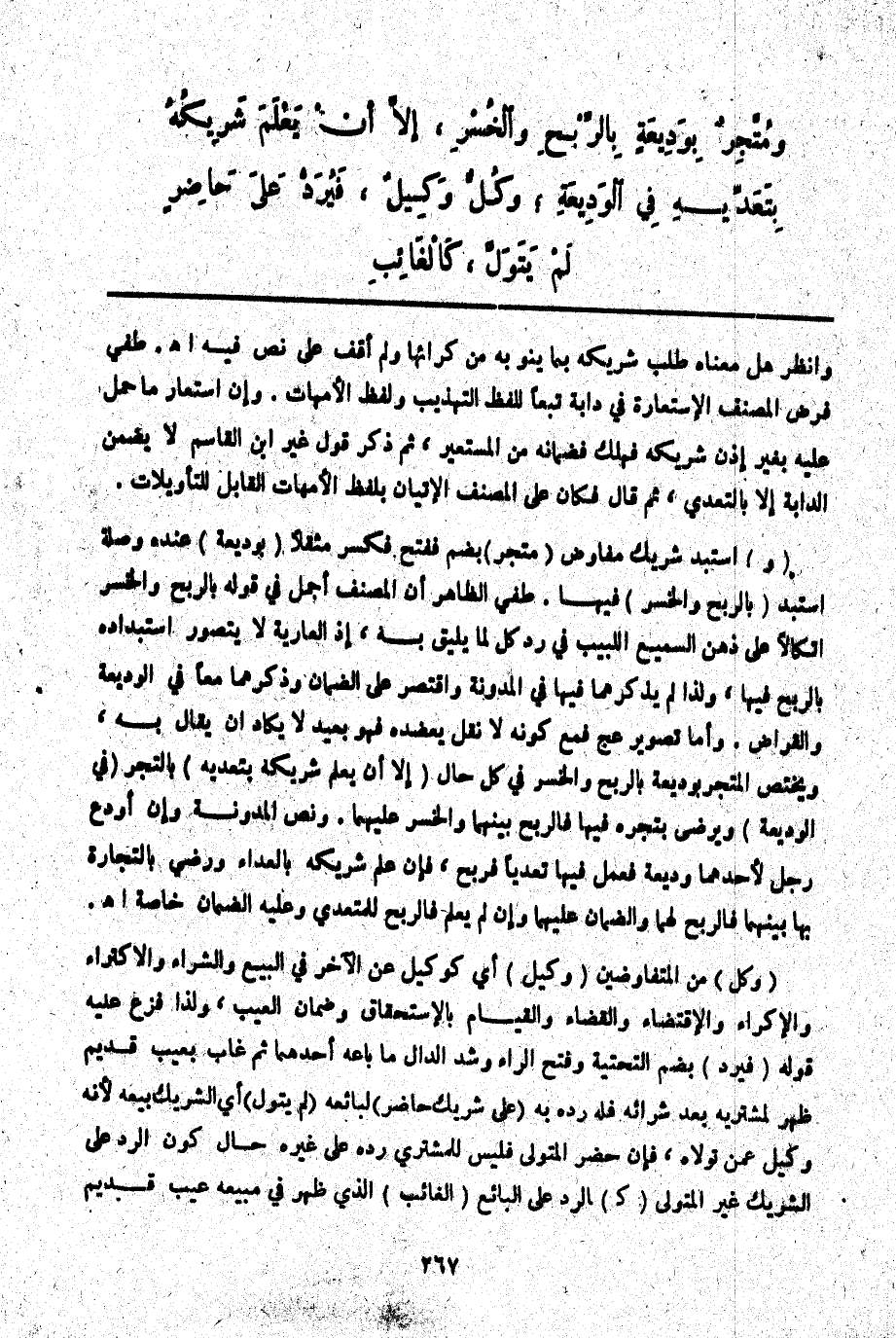 (وَ) اسْتَبَدَّ شَرِيكٌ مُفَاوِضٌ (مُتَّجِرٌ) بِضَمٍّ فَفَتْحٍ فَكَسْرٍ مُثَقَّلًا (بِوَدِيعَةٍ) عِنْدَهُ وَصِلَةُ اسْتَبَدَّ (بِالرِّبْحِ وَالْخُسْرِ) فِيهَا. طفي الظَّاهِرُ أَنَّ الْمُصَنِّفَ أَجْمَلَ فِي قَوْلِهِ بِالرِّبْحِ وَالْخُسْرِ اتِّكَالًا عَلَى ذِهْنِ السَّمِيعِ اللَّبِيبِ فِي رَدِّ كُلِّ مَا يَلِيقُ بِهِ، إذْ الْعَارِيَّةُ لَا يُتَصَوَّرُ اسْتِبْدَادُهُ بِالرِّبْحِ فِيهَا، وَلِذَا لَمْ يَذْكُرْهُمَا فِيهَا فِي الْمُدَوَّنَةِ وَاقْتَصَرَ عَلَى الضَّمَانِ وَذَكَرَهُمَا مَعًا فِي الْوَدِيعَةِ وَالْقِرَاضِ. وَأَمَّا تَصْوِيرُ عج فَمَعَ كَوْنِهِ لَا نَقْلٌ يُعَضِّدُهُ فَهُوَ بَعِيدٌ لَا يَكَادُ أَنْ يُقَالَ بِهِ، وَيَخْتَصُّ الْمُتَّجِرُ بِوَدِيعَةٍ بِالرِّبْحِ وَالْخُسْرِ فِي كُلِّ حَالٍ (إلَّا أَنْ يَعْلَمَ شَرِيكُهُ بِتَعَدِّيهِ) بِالتَّجْرِ (فِي الْوَدِيعَةِ) وَيَرْضَى بِتَجْرِهِ فِيهَا فَالرِّبْحُ بَيْنَهُمَا وَالْخُسْرُ عَلَيْهِمَا. وَنَصُّ الْمُدَوَّنَةِ وَإِنْ أَوْدَعَ رَجُلٌ لِأَحَدِهِمَا وَدِيعَةً فَعَمَل فِيهَا تَعَدِّيًا فَرَبِحَ، فَإِنْ عَلِمَ شَرِيكُهُ بِالْعَدَاءِ وَرَضِيَ بِالتِّجَارَةِ بِهَا بَيْنَهُمَا فَالرِّبْحُ لَهُمَا وَالضَّمَانُ عَلَيْهِمَا وَإِنْ لَمْ يَعْلَمْ فَالرِّبْحُ لِلْمُتَعَدِّي وَعَلَيْهِ الضَّمَانُ خَاصَّةً اهـ.