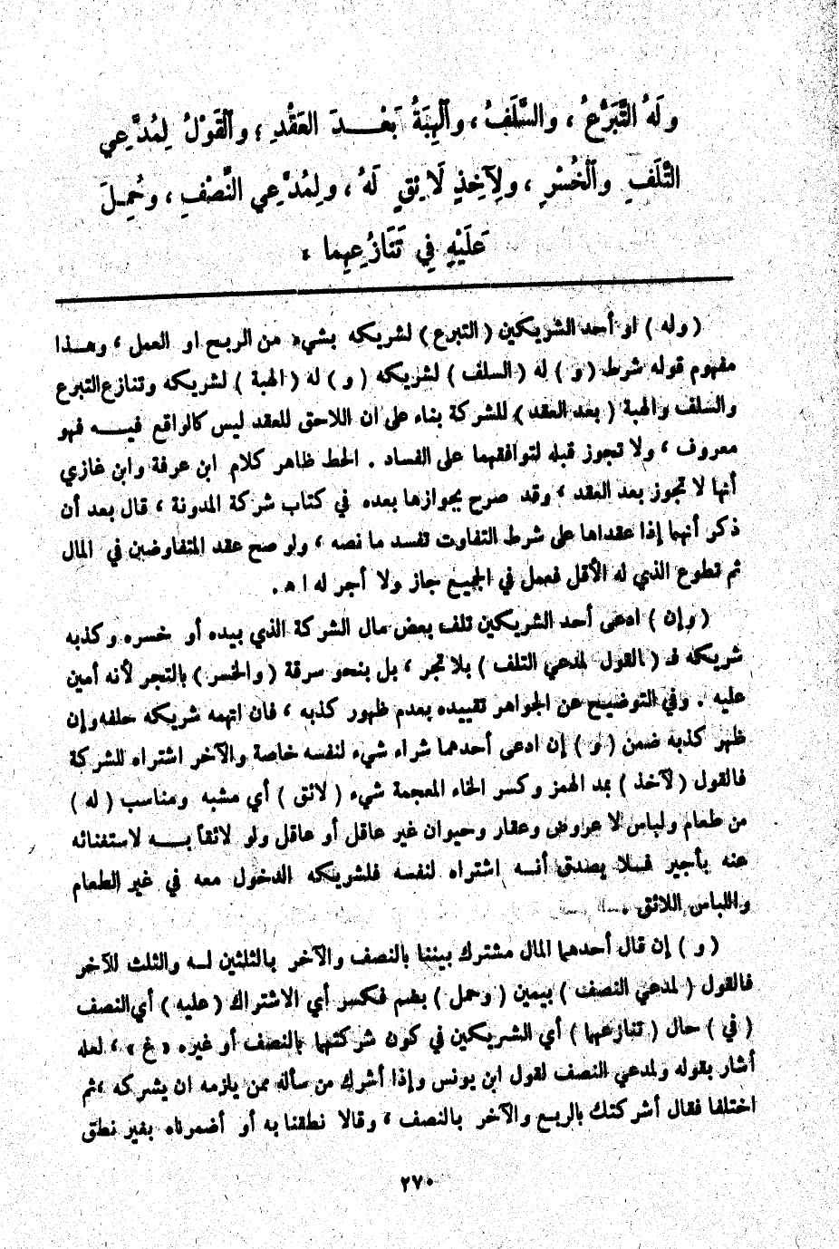 (وَإِنْ) ادَّعَى أَحَدُ الشَّرِيكَيْنِ تَلَفَ بَعْضِ مَالِ الشَّرِكَةِ الَّذِي بِيَدِهِ أَوْ خُسْرَهُ وَكَذَّبَهُ شَرِيكُهُ فَ (الْقَوْلُ لِمُدَّعِي التَّلَفِ) بِلَا تَجْرٍ، بَلْ بِنَحْوِ سَرِقَةٍ (وَالْخُسْرِ) بِالتَّجْرِ لِأَنَّهُ أَمِينٌ عَلَيْهِ. وَفِي التَّوْضِيحِ عَنْ الْجَوَاهِرِ تَقْيِيدُهُ بِعَدَمِ ظُهُورِ كَذِبِهِ، فَإِنْ اتَّهَمَهُ شَرِيكُهُ حَلَّفَهُ وَإِنْ ظَهَرَ كَذِبُهُ ضَمِنَ
