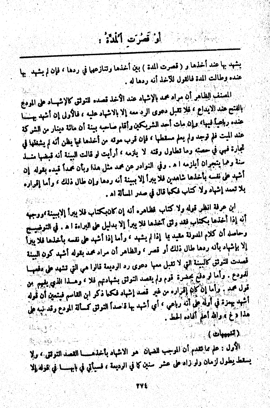 ـــــــــــــــــــــــــــــQيُشْهِدْ بِهَا عِنْدَ أَخْذِهَا و (قَصُرَتْ الْمُدَّةُ) بَيْنَ أَخْذِهَا وَتَنَازُعِهِمَا فِي رَدِّهَا، فَإِنْ لَمْ يُشْهِدْ بِهَا عِنْدَهُ وَطَالَتْ الْمُدَّةُ فَالْقَوْلُ لِلْآخِذِ أَنَّهُ رَدَّهَا لَهُ.