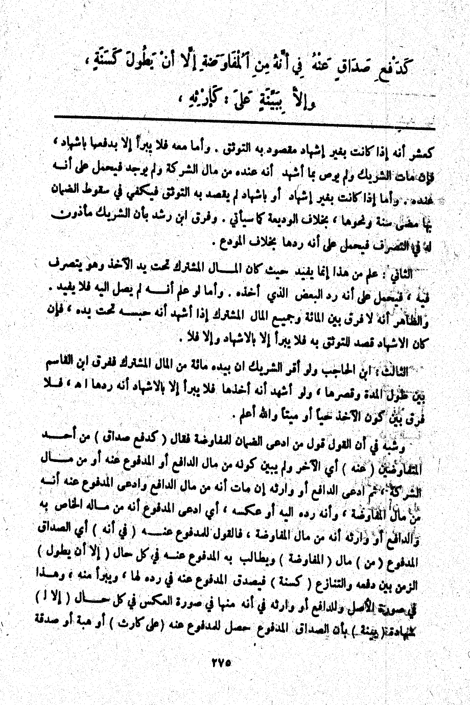 ـــــــــــــــــــــــــــــQكَعَشْرٍ أَنَّهُ إذَا كَانَتْ بِغَيْرِ إشْهَادٍ مَقْصُودٍ بِهِ التَّوَثُّقُ. وَأَمَّا مَعَهُ فَلَا يَبْرَأُ إلَّا بِدَفْعِهَا بِإِشْهَادٍ، فَإِنْ مَاتَ الشَّرِيكُ وَلَمْ يُوصِي بِمَا أَشْهَدَ أَنَّهُ عِنْدَهُ مِنْ مَالِ الشَّرِكَةِ وَلَمْ يُوجَدْ فَيُحْمَلُ عَلَى أَنَّهُ عِنْدَهُ. وَأَمَّا إذَا كَانَتْ بِغَيْرِ إشْهَادٍ أَوْ بِإِشْهَادٍ لَمْ يُقْصَدْ بِهِ التَّوَثُّقُ فَيَكْفِي فِي سُقُوطِ الضَّمَانِ بِهَا مُضِيُّ سَنَةٍ وَنَحْوِهَا، بِخِلَافِ الْوَدِيعَةِ كَمَا سَيَأْتِي. وَفَرَّقَ ابْنُ رُشْدٍ بِأَنَّ الشَّرِيكَ مَأْذُونٌ لَهُ فِي التَّصَرُّفِ فَيُحْمَلُ عَلَى أَنَّهُ رَدَّهَا بِخِلَافِ الْمُودِعِ.