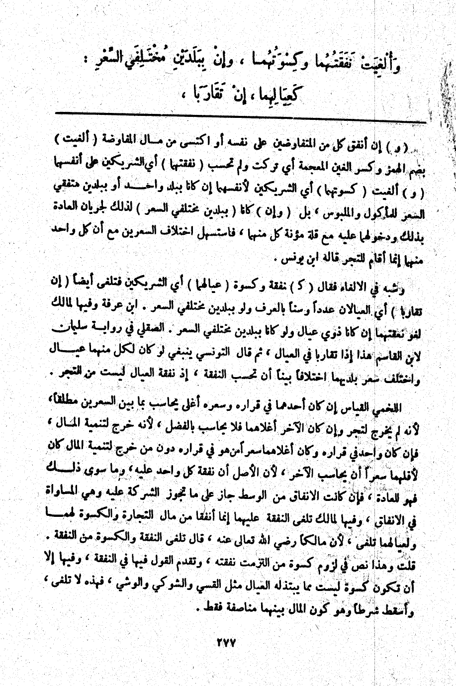 وَشَبَّهَ فِي الْإِلْغَاءِ فَقَالَ (كَ) نَفَقَةِ وَكِسْوَةِ (عِيَالِهِمَا) أَيْ الشَّرِيكَيْنِ فَتُلْغَيْ أَيْضًا (إنْ تَقَارَبَا) أَيْ الْعِيَالَانِ عَدَدًا وَسِنًّا بِالْعُرْفِ وَلَوْ بِبَلَدَيْنِ مُخْتَلِفَيْ السِّعْرِ. ابْنُ عَرَفَةَ وَفِيهَا لِمَالِكٍ لَغْوُ نَفَقَتِهِمَا إنْ كَانَا ذَوَيْ عِيَالٍ وَلَوْ كَانَا بِبَلَدَيْنِ مُخْتَلِفَيْ السِّعْرِ. الصِّقِلِّيُّ فِي رِوَايَةِ سُلَيْمَانَ لِابْنِ الْقَاسِمِ هَذَا إذَا تَقَارَبَا فِي الْعِيَالِ، ثُمَّ قَالَ التُّونُسِيُّ يَنْبَغِي لَوْ كَانَ لِكُلٍّ مِنْهُمَا عِيَالٌ وَاخْتَلَفَ سِعْرُ بَلَدَيْهِمَا اخْتِلَافًا بَيِّنًا أَنْ تُحْسَبَ النَّفَقَةُ إذْ نَفَقَةُ الْعِيَالِ لَيْسَتْ مِنْ التَّجْرِ. اللَّخْمِيُّ الْقِيَاسُ إنْ كَانَ أَحَدُهُمَا فِي قَرَارِهِ وَسِعْرِهِ أَغْلَى يُحَاسَبُ بِمَا بَيْنَ السِّعْرَيْنِ مُطْلَقًا لِأَنَّهُ لَمْ يَخْرُجْ لِتَجْرٍ وَإِنْ كَانَ الْآخَرُ أَغْلَاهُمَا فَلَا يُحَاسَبُ بِالْفَضْلِ لِأَنَّهُ خَرَجَ لِتَنْمِيَةِ الْمَالِ، فَإِنْ كَانَ وَاحِدٌ فِي قَرَارِهِ وَكَانَ أَغْلَاهُمَا سِعْرًا مَنْ هُوَ فِي قَرَارِهِ دُونَ مَنْ خَرَجَ لِتَنْمِيَةِ الْمَالِ كَانَ لِأَقَلِّهِمَا سِعْرًا أَنْ يُحَاسِبَ الْآخَرَ لِأَنَّ الْأَصْلَ أَنَّ نَفَقَةَ كُلِّ وَاحِدٍ عَلَيْهِ، وَمَا سِوَى ذَلِكَ فَهُوَ لِلْعَادَةِ، فَإِنْ كَانَتْ الْإِنْفَاقُ مِنْ الْوَسَطِ جَازَ عَلَى مَا تَجُوزُ الشَّرِكَةُ عَلَيْهِ وَهِيَ الْمُسَاوَاةُ فِي الْإِنْفَاقِ، وَفِيهَا لِمَالِكٍ تُلْغَى النَّفَقَةُ عَلَيْهِمَا إنَّمَا أَنْفَقَا مِنْ مَالِ التِّجَارَةِ وَالْكِسْوَةُ لَهُمَا وَلِعِيَالِهِمَا تُلْغَى لِأَنَّ مَالِكًا - رَضِيَ اللَّهُ تَعَالَى عَنْهُ -، قَالَ تُلْغَيْ النَّفَقَةُ وَالْكِسْوَةُ مِنْ النَّفَقَةِ. قُلْت وَهَذَا نَصٌّ فِي لُزُومِ كِسْوَةِ مَنْ الْتَزَمَتْ نَفَقَتُهُ، وَتَقَدَّمَ الْقَوْلُ فِيهَا فِي النَّفَقَةِ، وَفِيهَا إلَّا أَنْ تَكُونَ كِسْوَةً لَيْسَتْ مِمَّا يَبْتَذِلُهُ الْعِيَالُ مِثْلَ الْقَسِّيِّ وَالشَّوْكِيِّ وَالْوَشْيِ، فَهَذِهِ لَا تُلْغَيْ، وَأَسْقَطَ شَرْطًا وَهُوَ كَوْنُ الْمَالِ بَيْنَهُمَا مُنَاصَفَةً فَقَطْ.