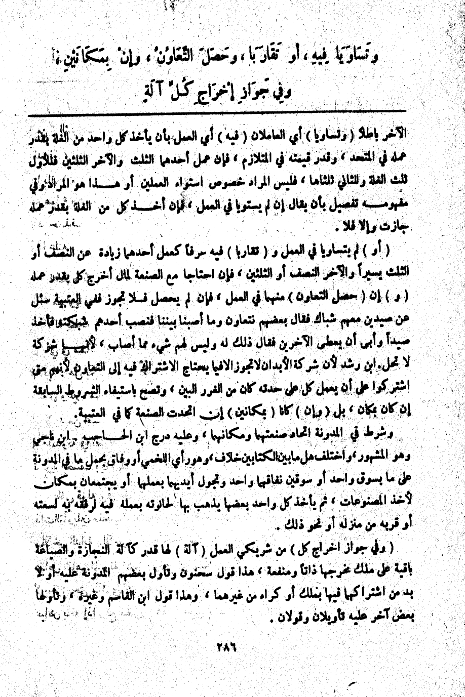 (وَفِي جَوَازِ إخْرَاجِ كُلِّ) مِنْ شَرِيكَيْ الْعَمَلِ (آلَةٍ) لَهَا قَدْرٌ كَآلَةِ النِّجَارَةِ وَالصِّيَاغَةُ بَاقِيَةٌ عَلَى مِلْكِ مُخْرِجِهَا ذَاتًا وَمَنْفَعَةً، هَذَا قَوْلُ سَحْنُونٍ وَتَأَوَّلَ بَعْضُهُمْ الْمُدَوَّنَةَ عَلَيْهِ أَوْ لَا بُدَّ مِنْ اشْتِرَاكِهِمَا فِيهَا بِمِلْكٍ أَوْ كِرَاءٍ مِنْ غَيْرِهِمَا، وَهَذَا قَوْلُ ابْنِ الْقَاسِمِ وَغَيْرِهِ، وَتَأَوَّلَهَا بَعْضٌ آخَرُ عَلَيْهِ تَأْوِيلَانِ وَقَوْلَانِ.