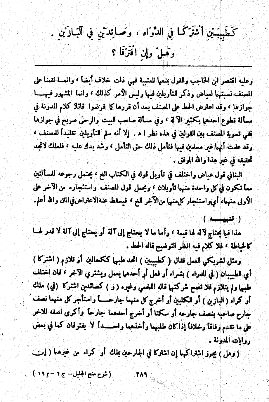 ـــــــــــــــــــــــــــــQوَعَلَيْهِ اقْتَصَرَ ابْنُ الْحَاجِبِ وَالْقَوْلُ بِمَنْعِهَا لِلْعُتْبِيَّةِ فَهِيَ ذَاتُ خِلَافٍ أَيْضًا، وَإِنَّمَا نَقَمْنَا عَلَى الْمُصَنِّفِ نِسْبَتَهُمَا لِعِيَاضٍ وَذَكَرَ التَّأْوِيلَيْنِ فِيهَا وَلَيْسَ الْأَمْرُ كَذَلِكَ، وَإِنَّمَا الْمَشْهُورُ فِيهَا جَوَازُهَا، وَقَدْ اعْتَرَضَ الْحَطّ عَلَى الْمُصَنِّفِ بَعْدَ أَنْ قَرَّرَهَا كَمَا فَرَضُوا قَائِلًا كَلَامُ الْمُدَوَّنَةِ فِي مَسْأَلَةِ تَطَوُّعِ أَحَدِهِمَا بِكَثِيرِ الْآلَةِ، وَفِي مَسْأَلَةِ صَاحِبِ الْبَيْتِ وَالرَّحَى صَرِيحٌ فِي جَوَازِهَا فَفِي تَسْوِيَةِ الْمُصَنِّفِ بَيْنَ الْقَوْلَيْنِ فِي هَذِهِ نَظَرٌ اهـ. إلَّا أَنَّهُ سَلَّمَ التَّأْوِيلَيْنِ تَقْلِيدًا لِلْمُصَنِّفِ، وَقَدْ عَلِمْت أَنَّهُمَا غَيْرُ مُسَلَّمَيْنِ فِيهَا فَتَأَمَّلْ ذَلِكَ حَقَّ التَّأَمُّلِ، وَشُدَّ يَدَك عَلَيْهِ، فَلَعَلَّك لَا تَجِدُ تَحْقِيقَهُ فِي غَيْرِ هَذَا وَاَللَّهُ الْمُوَفِّقُ.