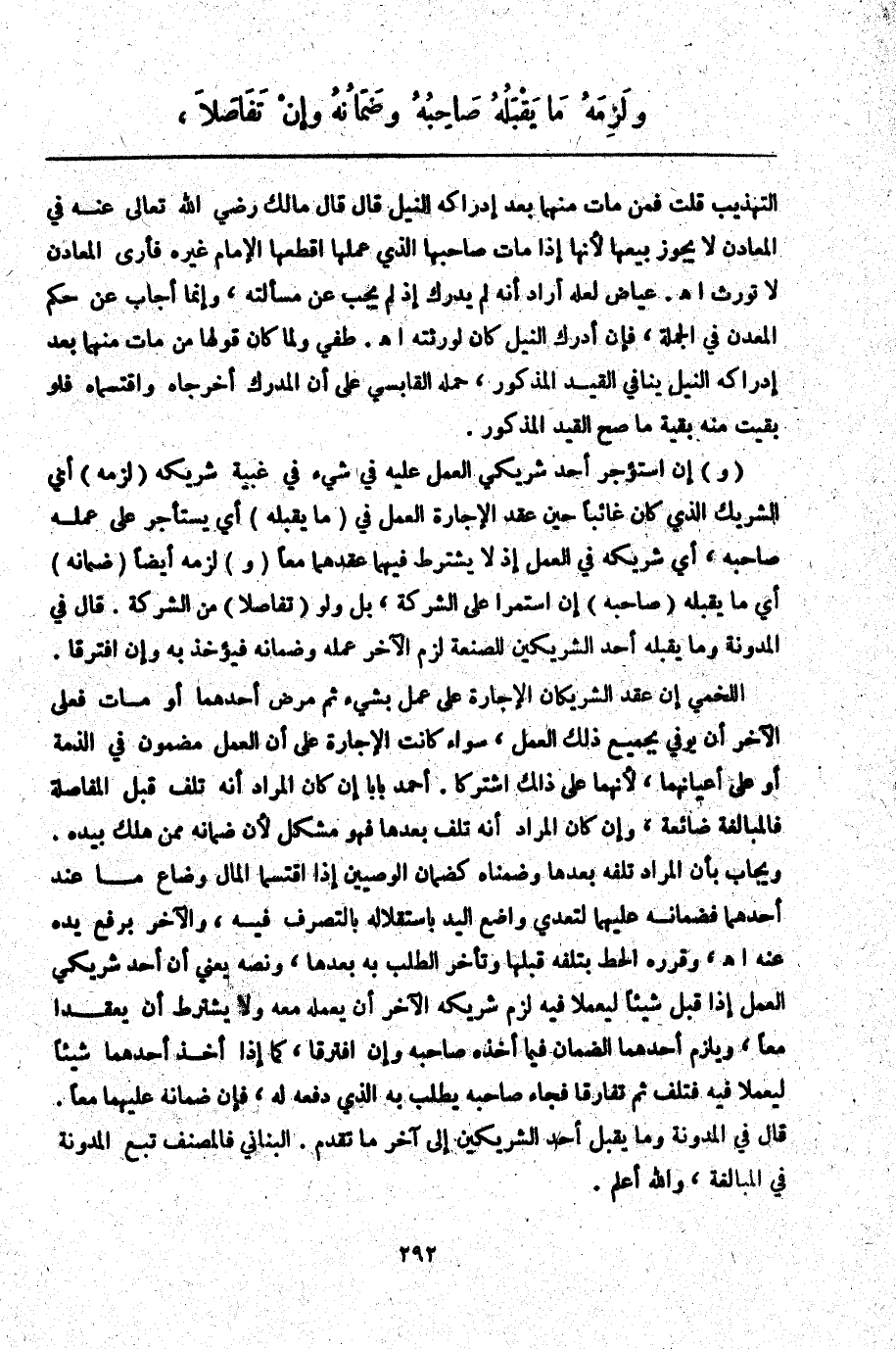 (وَ) إنْ اُسْتُؤْجِرَ أَحَدُ شَرِيكَيْ الْعَمَلِ عَلَيْهِ فِي شَيْءٍ فِي غَيْبَةِ شَرِيكِهِ (لَزِمَهُ) أَيْ الشَّرِيكَ الَّذِي كَانَ غَائِبًا حِينَ عَقْدِ الْإِجَارَةِ الْعَمَلُ فِي (مَا يَقْبَلُهُ) أَيْ يَسْتَأْجِرُ عَلَى عَمَلِهِ صَاحِبَهُ، أَيْ شَرِيكَهُ فِي الْعَمَلِ إذْ لَا يُشْتَرَطُ فِيهِمَا عَقْدُهُمَا مَعًا (وَ) لَزِمَهُ أَيْضًا (ضَمَانُهُ) أَيْ مَا يَقْبَلُهُ (صَاحِبُهُ) إنْ اسْتَمَرَّا عَلَى الشَّرِكَةِ، بَلْ وَلَوْ (تَفَاصَلَا) مِنْ الشَّرِكَةِ. قَالَ فِي الْمُدَوَّنَةِ وَمَا يَقْبَلُهُ أَحَدُ الشَّرِيكَيْنِ لِلصَّنْعَةِ لَزِمَ الْآخَرَ عَمَلُهُ وَضَمَانُهُ فَيُؤْخَذُ بِهِ وَإِنْ افْتَرَقَا. اللَّخْمِيُّ إنْ عَقَدَ الشَّرِيكَانِ الْإِجَارَةَ عَلَى عَمَلٍ بِشَيْءٍ ثُمَّ مَرِضَ أَحَدُهُمَا أَوْ مَاتَ فَعَلَى الْآخَرِ أَنْ يُوَفِّيَ بِجَمِيعِ ذَلِكَ الْعَمَلِ، سَوَاءٌ كَانَتْ الْإِجَارَةُ عَلَى أَنَّ الْعَمَلَ مَضْمُونٌ فِي الذِّمَّةِ أَوْ عَلَى أَعْيَانِهِمَا لِأَنَّهُمَا عَلَى ذَلِكَ اشْتَرَكَا. أَحْمَدُ بَابَا إنْ كَانَ الْمُرَادُ أَنَّهُ تَلِفَ قَبْلَ الْمَقَالَةِ فَالْمُبَالَغَةُ ضَائِعَةٌ، وَإِنْ كَانَ الْمُرَادُ أَنَّهُ تَلِفَ بَعْدَهَا فَهُوَ مُشْكِلٌ لِأَنَّ ضَمَانَهُ مِمَّنْ هَلَكَ بِيَدِهِ.