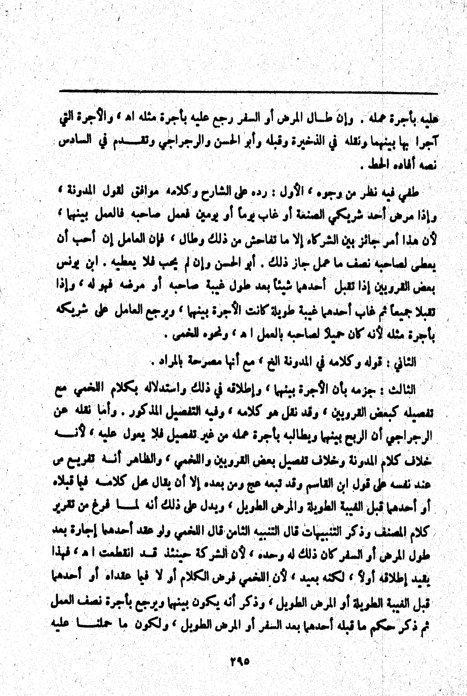 طفي فِيهِ نَظَرٌ مِنْ وُجُوهٍ، الْأَوَّلِ: رَدُّهُ عَلَى الشَّارِحِ وَكَلَامُهُ مُوَافِقٌ لِقَوْلِ الْمُدَوَّنَةِ، وَإِذَا مَرِضَ أَحَدُ شَرِيكَيْ الصَّنْعَةِ أَوْ غَابَ يَوْمًا أَوْ يَوْمَيْنِ فَعَمِلَ صَاحِبُهُ فَالْعَمَلُ بَيْنَهُمَا لِأَنَّ هَذَا أَمْرٌ جَائِزٌ بَيْنَ الشُّرَكَاءِ إلَّا مَا تَفَاحَشَ مِنْ ذَلِكَ وَطَالَ، فَإِنَّ الْعَامِلَ إنْ أَحَبَّ أَنْ يُعْطِيَ لِصَاحِبِهِ نِصْفَ مَا عَمِلَ جَازَ ذَلِكَ. أَبُو الْحَسَنِ وَإِنْ لَمْ يُحِبَّ فَلَا يُعْطِيهِ. ابْنُ يُونُسَ بَعْضُ الْقَرَوِيِّينَ إذَا تَقَبَّلَ أَحَدُهُمَا شَيْئًا بَعْدَ طُولِ غَيْبَةِ صَاحِبِهِ أَوْ مَرَضِهِ فَهُوَ لَهُ، وَإِذَا تَقَبَّلَا جَمِيمًا ثُمَّ غَابَ أَحَدُهُمَا غَيْبَةً طَوِيلَةً كَانَتْ الْأُجْرَةُ بَيْنَهُمَا، وَيَرْجِعُ الْعَامِلُ عَلَى شَرِيكِهِ بِأُجْرَةِ مِثْلِهِ لِأَنَّهُ كَانَ حَمِيلًا لِصَاحِبِهِ بِالْعَمَلِ. اهـ. وَنَحْوِهِ اللَّخْمِيُّ.