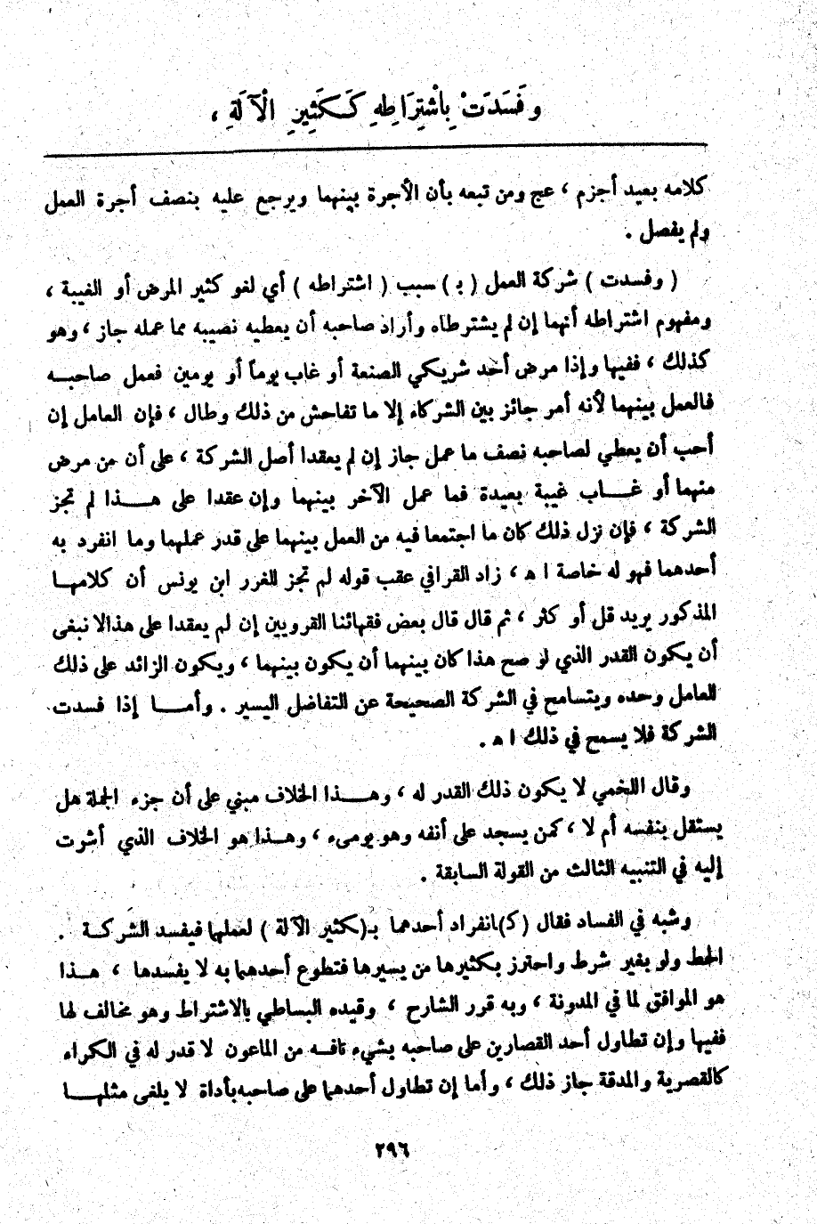 وَشَبَّهَ فِي الْفَسَادِ فَقَالَ (كَ) انْفِرَادِ أَحَدِهِمَا بِ (كَثِيرِ الْآلَةِ) لِعَمَلِهِمَا فَيُفْسِدُ الشَّرِكَةَ.