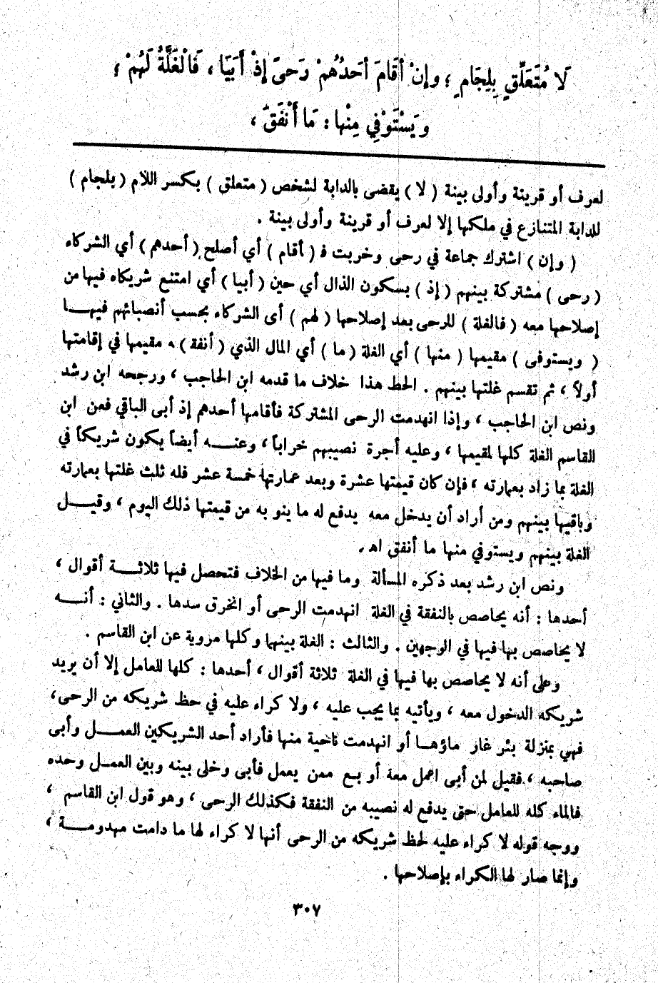 (وَإِنْ) اشْتَرَكَ جَمَاعَةٌ فِي رَحًى وَخَرِبَتْ فَ (أَقَامَ) أَيْ أَصْلَحَ (أَحَدُهُمْ) أَيْ الشُّرَكَاءِ (رَحًى) مُشْتَرَكَةً بَيْنَهُمْ (إذْ) بِسُكُونِ الذَّالِ أَيْ حِينَ (أَبَيَا) أَيْ امْتَنَعَ شَرِيكَاهُ فِيهَا مِنْ إصْلَاحِهَا مَعَهُ (فَالْغَلَّةُ) لِلرَّحَى بَعْدَ إصْلَاحِهَا (لَهُمْ) أَيْ الشُّرَكَاءِ بِحَسَبِ أَنْصِبَائِهِمْ فِيهَا (وَيَسْتَوْفِي) مُقِيمُهَا (مِنْهَا) أَيْ الْغَلَّةِ (مَا) أَيْ الْمَالَ الَّذِي (أَنْفَقَ) هـ مُقِيمُهَا فِي إقَامَتِهَا أَوَّلًا، ثُمَّ تُقْسَمُ غَلَّتُهَا بَيْنَهُمْ. الْحَطّ هَذَا خِلَافُ مَا قَدَّمَهُ ابْنُ الْحَاجِبِ وَرَجَّحَهُ ابْنُ رُشْدٍ وَنَصَّ ابْنُ الْحَاجِبِ، وَإِذَا انْهَدَمَتْ الرَّحَى الْمُشْتَرَكَةُ فَأَقَامَهَا أَحَدُهُمْ إذْ أَبَى الْبَاقِي فَعَنْ ابْنِ الْقَاسِمِ الْغَلَّةُ كُلُّهَا لِمُقِيمِهَا، وَعَلَيْهِ أُجْرَةُ نَصِيبِهِمْ خَرَابًا، وَعَنْهُ أَيْضًا يَكُونُ شَرِيكًا فِي الْغَلَّةِ بِمَا زَادَ بِعِمَارَتِهِ؛ فَإِنْ كَانَ قِيمَتُهَا عَشَرَةً وَبَعْدَ عِمَارَتِهَا خَمْسَةَ عَشَرَ فَلَهُ ثُلُثُ غَلَّتِهَا بِعِمَارَتِهِ وَبَاقِيهَا بَيْنَهُمْ وَمَنْ أَرَادَ أَنْ يَدْخُلَ مَعَهُ يَدْفَعُ لَهُ مَا يَنُوبُهُ مِنْ قِيمَتِهَا ذَلِكَ الْيَوْمَ، وَقِيلَ الْغَلَّةُ بَيْنَهُمْ وَيَسْتَوْفِي مِنْهَا مَا أَنْفَقَ اهـ. وَنَصَّ ابْنُ رُشْدٍ بَعْدَ ذِكْرِهِ الْمَسْأَلَةِ وَمَا فِيهَا مِنْ الْخِلَافِ فَتَحَصَّلَ فِيهَا ثَلَاثَةُ أَقْوَالٍ، أَحَدُهَا: أَنَّهُ يُحَاصِصُ بِالنَّفَقَةِ فِي الْغَلَّةِ انْهَدَمَتْ الرَّحَى أَوْ انْخَرَقَ سَدُّهَا. وَالثَّانِي: أَنَّهُ لَا يُحَاصِصُ بِهَا فِيهَا فِي الْوَجْهَيْنِ. وَالثَّالِثُ: الْغَلَّةُ بَيْنَهُمَا وَكُلُّهَا مَرْوِيَّةٌ عَنْ ابْنِ الْقَاسِمِ. وَعَلَى أَنَّهُ لَا يُحَاصِصُ بِهَا فِيهَا فِي الْغَلَّةِ ثَلَاثَةُ أَقْوَالٍ، أَحَدُهَا: كُلُّهَا لِلْعَامِلِ إلَّا أَنْ يُرِيدَ شَرِيكُهُ الدُّخُولَ مَعَهُ، وَيَأْتِيهِ بِمَا يَجِبُ عَلَيْهِ، وَلَا كِرَاءَ عَلَيْهِ فِي حَظِّ شَرِيكِهِ مِنْ الرَّحَى فَهِيَ بِمَنْزِلَةِ بِئْرٍ غَارَ مَاؤُهَا أَوْ انْهَدَمَتْ نَاحِيَةٌ مِنْهَا فَأَرَادَ أَحَدُ الشَّرِيكَيْنِ الْعَمَلَ وَأَبَى صَاحِبُهُ فَقِيلَ لِمَنْ أَبَى اعْمَلْ مَعَهُ أَوْ بِعْ مِمَّنْ يَعْمَلُ فَأَبَى وَخَلَّى بَيْنَهُ وَبَيْنَ الْعَمَلِ وَحْدَهُ فَالْمَاءُ كُلُّهُ لِلْعَامِلِ حَتَّى يَدْفَعَ لَهُ نَصِيبَهُ مِنْ النَّفَقَةِ فَكَذَلِكَ الرَّحَى، وَهُوَ قَوْلُ ابْنِ الْقَاسِمِ، وَوَجْهُ قَوْلِهِ لَا كِرَاءَ عَلَيْهِ لَحَظِّ شَرِيكِهِ مِنْ الرَّحَى أَنَّهَا لَا كِرَاءَ لَهَا مَا دَامَتْ مَهْدُومَةً، وَإِنَّمَا صَارَ لَهَا الْكِرَاءُ بِإِصْلَاحِهَا.