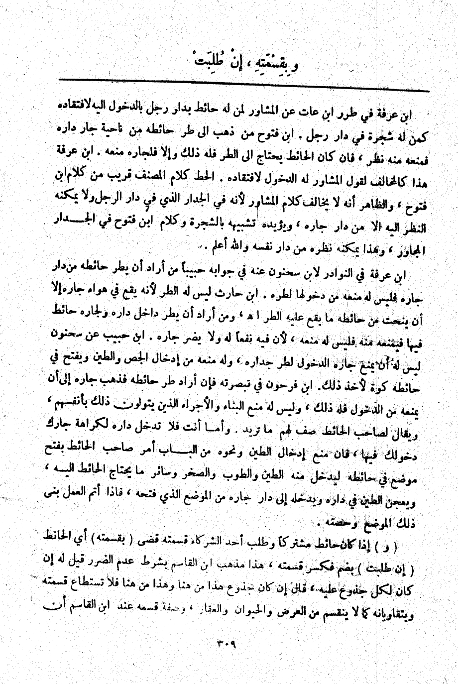 ابْنُ عَرَفَةَ فِي النَّوَادِرِ لِابْنِ سَحْنُونٍ عَنْهُ فِي جَوَابِهِ حَبِيبًا مَنْ أَرَادَ أَنْ يُطِرَّ حَائِطَهُ مِنْ دَارِ جَارِهِ فَلَيْسَ لَهُ مَنْعُهُ مِنْ دُخُولِهَا لِطَرِّهِ. ابْنُ حَارِثٍ لَيْسَ لَهُ الطَّرُّ لِأَنَّهُ يَقَعُ فِي هَوَاءِ جَارِهِ إلَّا أَنْ يَنْحِتَ مِنْ حَائِطٍ مَا يَقَعُ عَلَيْهِ الطَّرُّ. اهـ. وَمَنْ أَرَادَ أَنْ يَطُرَّ دَاخِلَ دَارِهِ وَلِجَارِهِ حَائِطٌ فِيهَا فَيَمْنَعُهُ مِنْهُ فَلَيْسَ لَهُ مَنْعُهُ وَلِأَنَّ فِيهِ نَفْعًا لَهُ وَلَا يَضُرُّ جَارَهُ. ابْنُ حَبِيبٍ عَنْ سَحْنُونٍ لَيْسَ لَهُ أَنْ يَمْنَعَ جَارَهُ الدُّخُولَ لِطَرِّ جِدَارِهِ، وَلَهُ مَنْعُهُ مِنْ إدْخَالِ الْجَصِّ وَالطِّينِ وَيَفْتَحُ فِي حَائِطِهِ كُوَّةً لِأَخْذِ ذَلِكَ. ابْنُ فَرْحُونٍ فِي تَبْصِرَتِهِ فَإِنْ أَرَادَ طَرَّ حَائِطِهِ فَذَهَبَ جَارُهُ إلَى أَنْ يَمْنَعَهُ مِنْ الدُّخُولِ فَلَهُ ذَلِكَ، وَلَيْسَ لَهُ مَنْعُ الْبِنَاءِ وَالْأُجَرَاءِ الَّذِينَ يَتَوَلَّوْنَ ذَلِكَ بِأَنْفُسِهِمْ، وَيُقَالُ لِصَاحِبِ الْحَائِطِ صِفْ لَهُمْ مَا تُرِيدُ وَأَمَّا أَنْتَ فَلَا تَدْخُلْ دَارِهِ لِكَرَاهَةِ جَارِك دُخُولَك فِيهَا، فَإِنْ مَنَعَ إدْخَالَ الطِّينِ وَنَحْوِهِ مِنْ الْبَابِ أُمِرَ صَاحِبُ الْحَائِطِ بِفَتْحِ مَوْضِعٍ فِي حَائِطِهِ لِيُدْخِلَ مِنْهُ الطِّينَ وَالطُّوبَ وَالصَّخْرَ وَسَائِرَ مَا يَحْتَاجُ الْحَائِطُ إلَيْهِ وَيَعْجِنُ الطِّينَ فِي دَارِهِ وَيُدْخِلُهُ إلَى دَارِ جَارِهِ مِنْ الْمَوْضِعِ الَّذِي فَتَحَهُ، فَإِذَا أَتَمَّ الْعَمَلَ بَنَى ذَلِكَ الْمَوْضِعَ وَحَصَّنَهُ.
