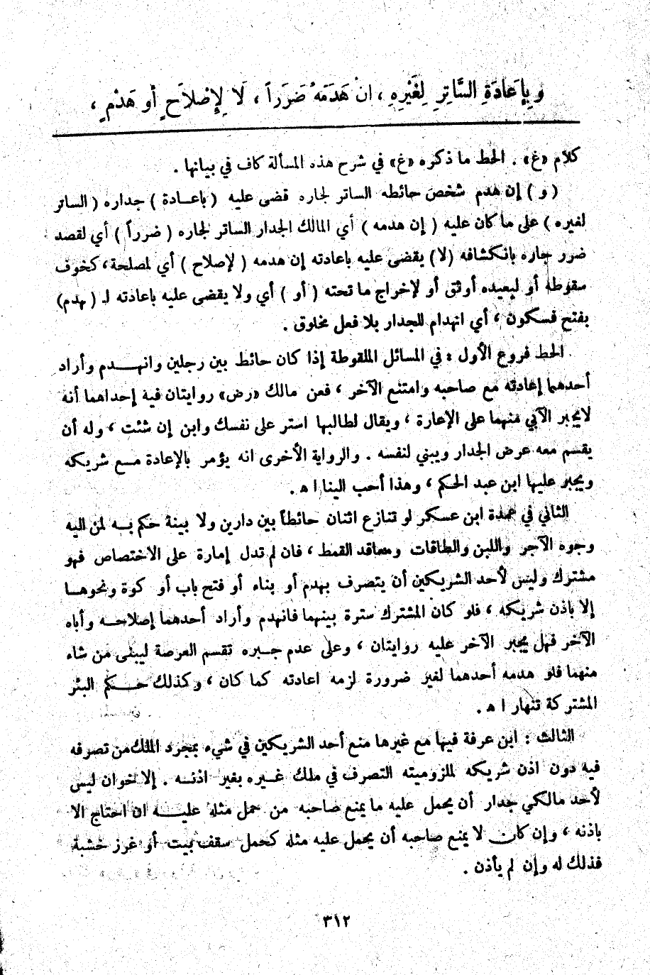 الثَّانِي فِي عُمْدَةِ ابْنِ عَسَاكِرَ لَوْ تَنَازَعَ اثْنَانِ حَائِطًا بَيْنَ دَارَيْنِ وَلَا بَيِّنَةَ حُكِمَ بِهِ لِمَنْ إلَيْهِ وُجُوهُ الْآخَرِ وَاللَّبِنُ وَالطَّاقَاتُ وَمَعَاقِدُ الْقُمُطِ، فَإِنْ لَمْ تَدُلَّ إمَارَةٌ عَلَى الِاخْتِصَاصِ فَهُوَ مُشْتَرَكٌ وَلَيْسَ لِأَحَدِ الشَّرِيكَيْنِ أَنْ يَتَصَرَّفَ بِهَدْمٍ أَوْ بِنَاءٍ أَوْ فَتْحِ بَابٍ أَوْ كُوَّةٍ وَنَحْوِهَا إلَّا بِإِذْنِ شَرِيكِهِ، فَلَوْ كَانَ الْمُشْتَرَكُ سُتْرَةً بَيْنَهُمَا فَانْهَدَمَ وَأَرَادَ أَحَدُهُمَا إصْلَاحَهُ وَأَبَاهُ الْآخَرُ فَهَلْ يُجْبَرُ الْآخَرُ عَلَيْهِ رِوَايَتَانِ، وَعَلَى عَدَمِ جَبْرِهِ تُقْسَمُ الْعَرْصَةُ لِيَبْنِيَ مَنْ شَاءَ مِنْهُمَا فَلَوْ هَدَمَهُ أَحَدُهُمَا لِغَيْرِ ضَرُورَةٍ لَزِمَهُ إعَادَتُهُ كَمَا كَانَ، وَكَذَلِكَ حُكْمُ الْبِئْرِ الْمُشْتَرَكَةِ تَنْهَارُ اهـ.