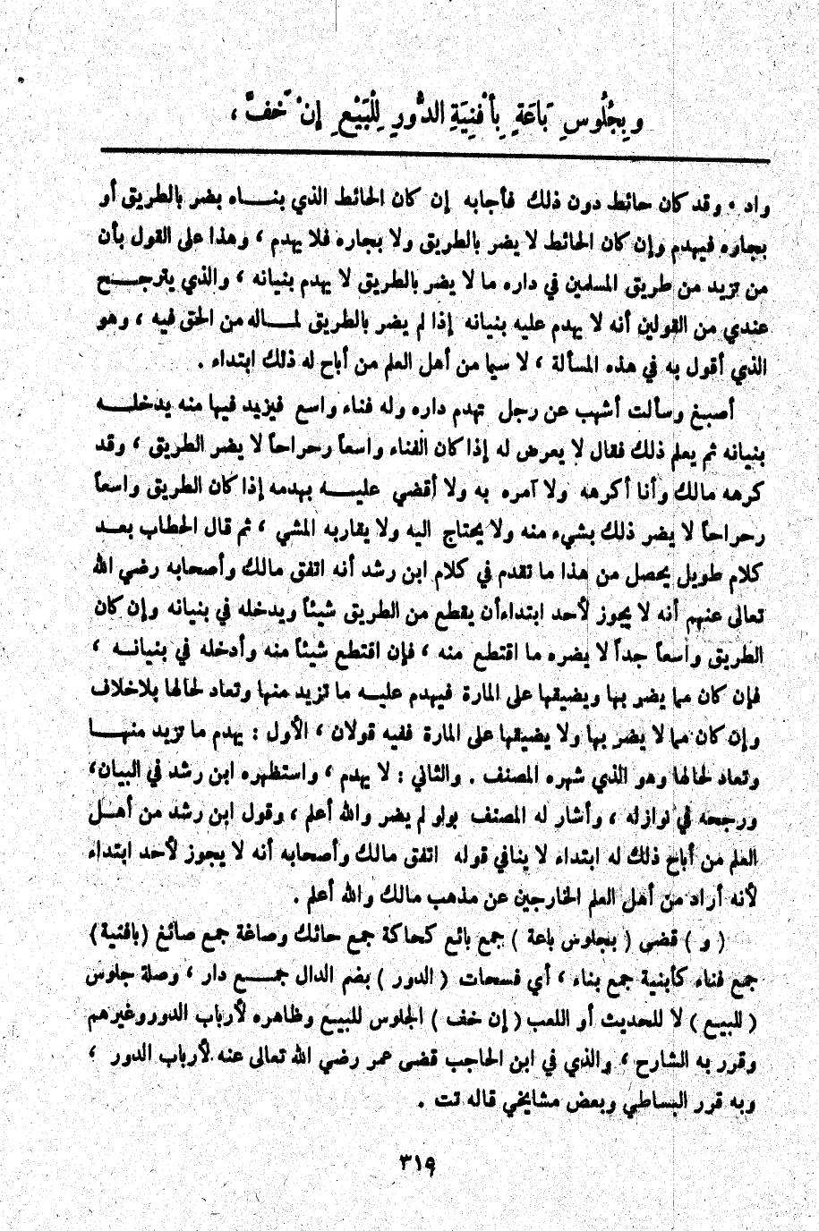 ـــــــــــــــــــــــــــــQوَادٍ وَقَدْ كَانَ حَائِطٌ دُونَ ذَلِكَ فَأَجَابَهُ إنْ كَانَ الْحَائِطُ الَّذِي بَنَاهُ يَضُرُّ بِالطَّرِيقِ أَوْ بِجَارِهِ فَيُهْدَمُ وَإِنْ كَانَ الْحَائِطُ لَا يَضُرُّ بِالطَّرِيقِ وَلَا بِجَارِهِ فَلَا يُهْدَمُ.