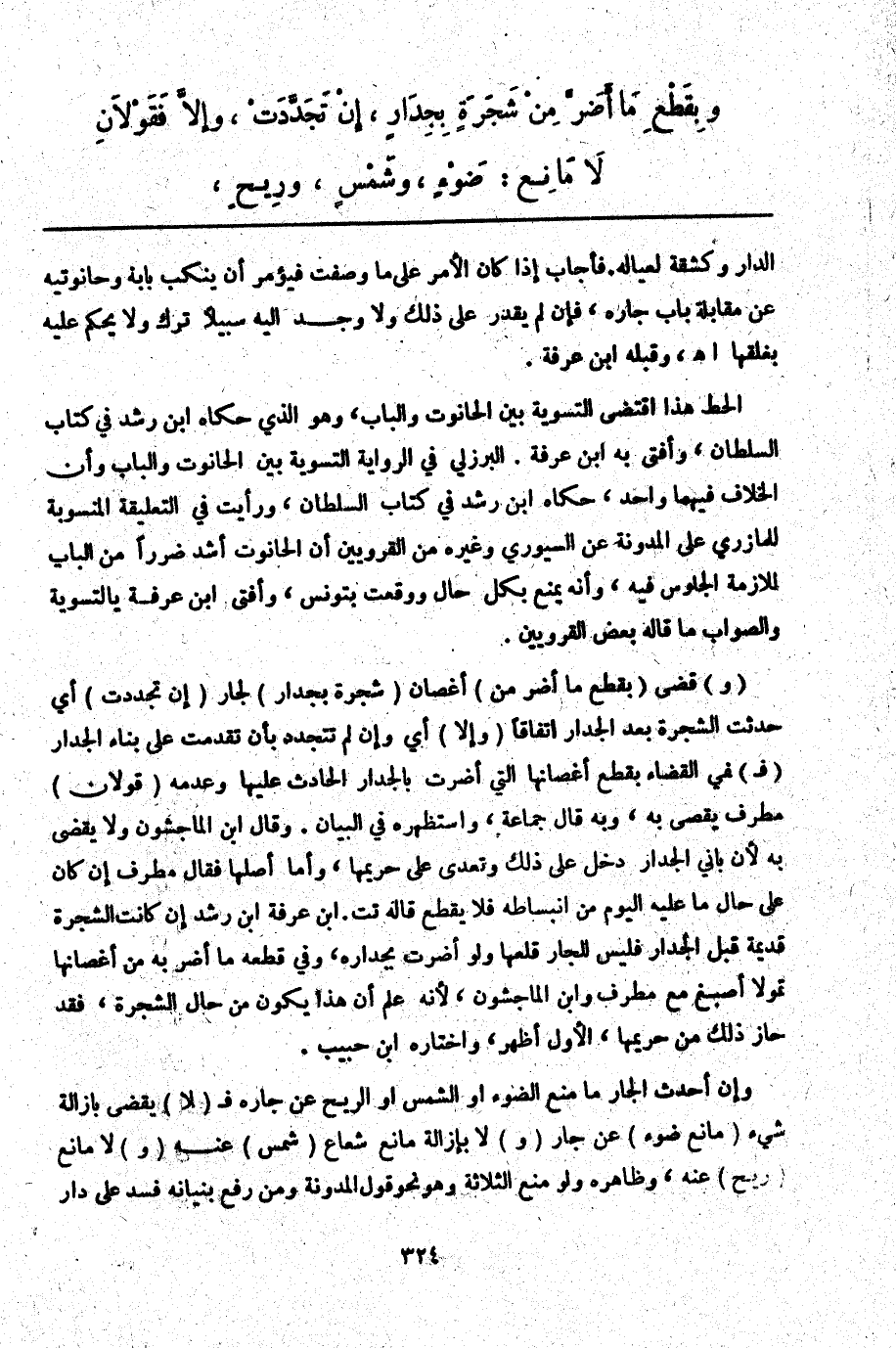 (وَ) قَضَى (بِقَطْعِ مَا أَضَرَّ مِنْ) أَغْصَانِ (شَجَرَةٍ بِجِدَارٍ) لِجَارٍ (إنْ تَجَدَّدَتْ) أَيْ حَدَثَتْ الشَّجَرَةُ بَعْدَ الْجِدَارِ اتِّفَاقًا (وَإِلَّا) أَيْ وَإِنْ لَمْ تَتَجَدَّدْ بِأَنْ تَقَدَّمَتْ عَلَى بِنَاءِ الْجِدَارِ (فَ) فِي الْقَضَاءِ بِقَطْعِ أَغْصَانِهَا الَّتِي أَضَرَّتْ بِالْجِدَارِ الْحَادِثِ عَلَيْهَا وَعَدَمِهِ (قَوْلَانِ) مُطَرِّفٌ يَقْضِي بِهِ، وَبِهِ قَالَ جَمَاعَةٌ وَاسْتَظْهَرَهُ فِي الْبَيَانِ. وَقَالَ ابْنُ الْمَاجِشُونِ وَلَا يُقْضَى بِهِ لِأَنَّ بَانِي الْجِدَارِ دَخَلَ عَلَى ذَلِكَ وَتَعَدَّى عَلَى حَرِيمِهَا، وَأَمَّا أَصْلُهَا فَقَالَ مُطَرِّفٌ إنْ كَانَ عَلَى حَالِ مَا عَلَيْهِ الْيَوْمَ مِنْ انْبِسَاطِهِ فَلَا يُقْطَعُ قَالَهُ تت ابْنُ عَرَفَةَ ابْنُ رُشْدٍ إنْ كَانَتْ الشَّجَرَةُ قَدِيمَةً قَبْلَ الْجِدَارِ فَلَيْسَ لِلْجَارِ قَلْعُهَا وَلَوْ أَضَرَّتْ بِجِدَارِهِ، وَفِي قَطْعِهِ مَا أَضَرَّ بِهِ مِنْ أَغْصَانِهَا قَوْلَا أَصْبَغَ مَعَ مُطَرِّفٍ وَابْنِ الْمَاجِشُونِ لِأَنَّهُ عَلِمَ أَنَّ هَذَا يَكُونُ مِنْ حَالِ الشَّجَرَةِ، فَقَدْ حَازَ ذَلِكَ مِنْ حَرِيمِهَا، الْأَوَّلُ أَظْهَرُ وَاخْتَارَهُ ابْنُ حَبِيبٍ.