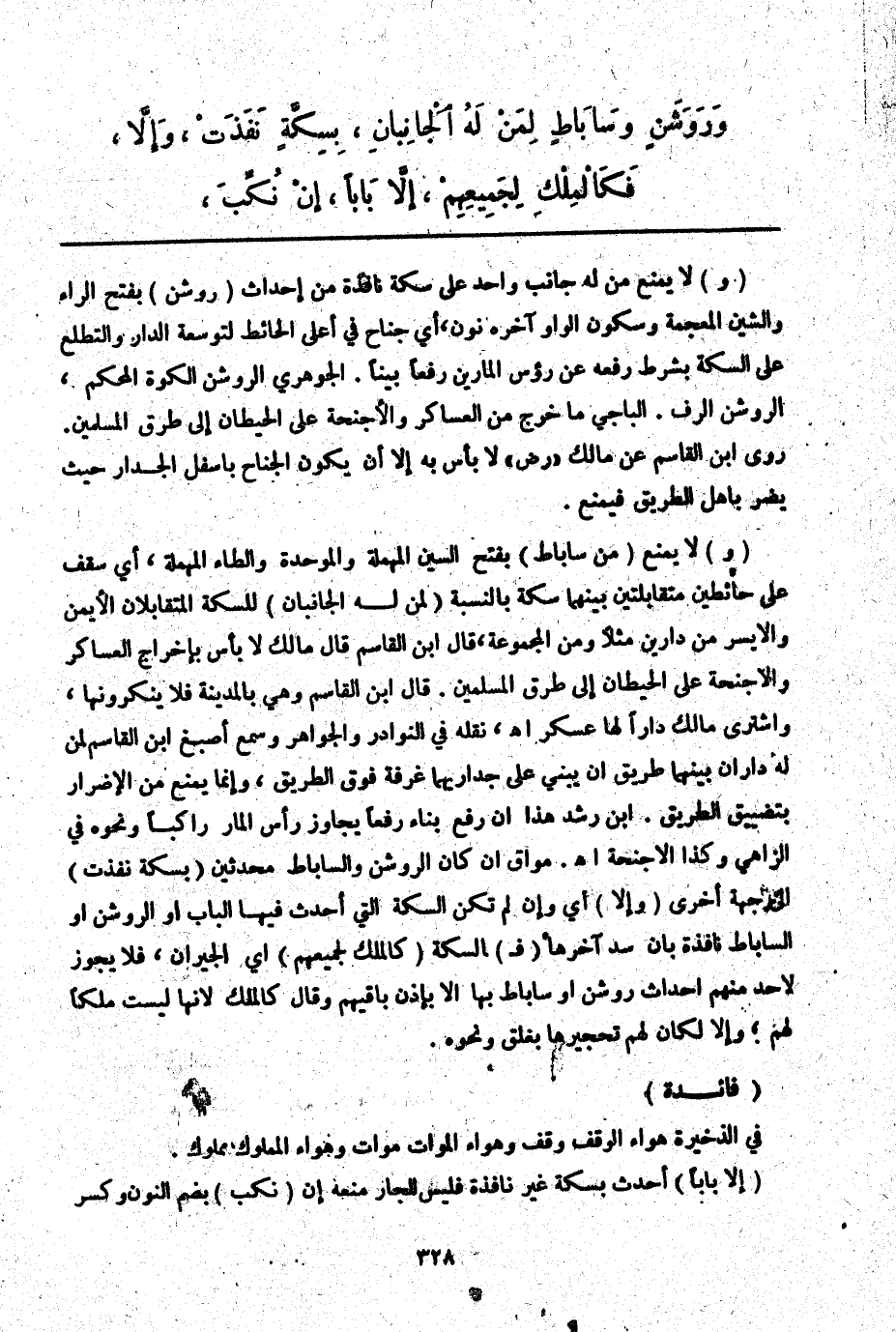 ـــــــــــــــــــــــــــــQ (وَ) لَا يُمْنَعُ مَنْ لَهُ جَانِبٌ وَاحِدٌ عَلَى سِكَّةٍ نَافِذَةٍ مِنْ إحْدَاثِ (رَوْشَنٍ) بِفَتْحِ الرَّاءِ وَالشِّينِ الْمُعْجَمَةِ وَسُكُونِ الْوَاوِ آخِرَهُ نُونٌ، أَيْ جَنَاحٌ فِي أَعْلَى الْحَائِطِ لِتَوْسِعَةِ الدَّارِ وَالتَّطَلُّعِ عَلَى السِّكَّةِ بِشَرْطِ رَفْعِهِ عَنْ رُءُوسِ الْمَارِّينَ رَفْعًا بَيِّنًا الْجَوْهَرِيِّ الرَّوْشَنُ الْكُوَّةُ الْمُحْكَمُ، الرَّوْشَنُ الرَّفُّ. الْبَاجِيَّ مَا خَرَجَ مِنْ الْعَسَاكِرِ وَالْأَجْنِحَةِ عَلَى الْحِيطَانِ إلَى طُرُقِ الْمُسْلِمِينَ. رَوَى ابْنُ الْقَاسِمِ عَنْ مَالِكٍ " - رَضِيَ اللَّهُ عَنْهُ - " لَا بَأْسَ بِهِ إلَّا أَنْ يَكُونَ الْجَنَاحُ بِأَسْفَلِ الْجِدَارِ حَيْثُ يَضُرُّ بِأَهْلِ الطَّرِيقِ فَيُمْنَعُ.