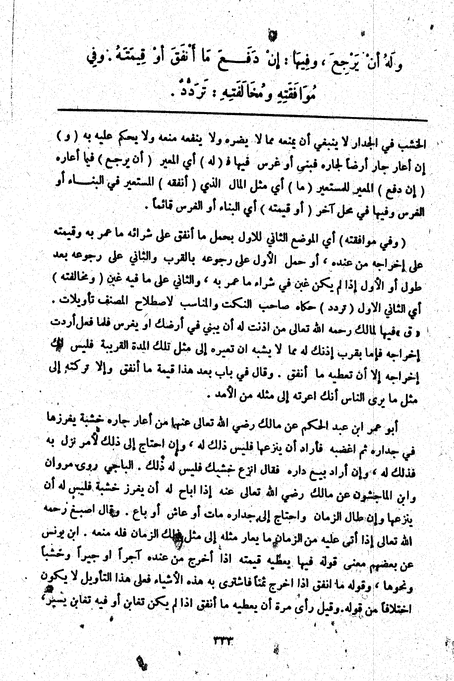 (وَفِي مُوَافَقَتِهِ) أَيْ الْمَوْضِعِ الثَّانِي لِلْأَوَّلِ بِحَمْلِ مَا أَنْفَقَ عَلَى شِرَائِهِ مَا عَمَّرَ بِهِ وَقِيمَتُهُ عَلَى إخْرَاجِهِ مِنْ عِنْدِهِ، أَوْ حُمِلَ الْأَوَّلُ عَلَى رُجُوعِهِ بِالْقُرْبِ وَالثَّانِي عَلَى رُجُوعِهِ بَعْدَ طُولٍ أَوْ الْأَوَّلُ إذَا لَمْ يَكُنْ غَبْنٌ فِي شِرَاءِ مَا عَمَّرَ بِهِ، وَالثَّانِي عَلَى مَا فِيهِ غَبْنٌ (وَمُخَالَفَتِهِ) أَيْ الثَّانِي الْأَوَّلَ (تَرَدُّدٌ) حَكَاهُ صَاحِبُ النُّكَتِ وَالْمُنَاسِبُ لِاصْطِلَاحِ الْمُصَنِّفِ تَأْوِيلَاتٌ. " ق " فِيهَا لِمَالِكٍ - رَحِمَهُ اللَّهُ تَعَالَى - مَنْ أَذِنْت لَهُ أَنْ يَبْنِيَ فِي أَرْضِك أَوْ يَغْرِسَ فَلَمَّا فَعَلَ أَرَدْت إخْرَاجَهُ فَإِمَّا بِقُرْبِ إذْنِك لَهُ مِمَّا لَا يُشْبِهُ أَنْ تُعِيرَهُ إلَى مِثْلِ تِلْكَ الْمُدَّةِ الْقَرِيبَةِ فَلَيْسَ لَك إخْرَاجُهُ إلَّا أَنْ تُعْطِيَهُ مَا أَنْفَقَ. وَقَالَ فِي بَابٍ بَعْدَ هَذَا قِيمَةُ مَا أَنْفَقَ وَإِلَّا تَرَكْته إلَى مِثْلِ مَا يَرَى النَّاسُ أَنَّك أَعَرْته إلَى مِثْلِهِ مِنْ الْأَمَدِ.