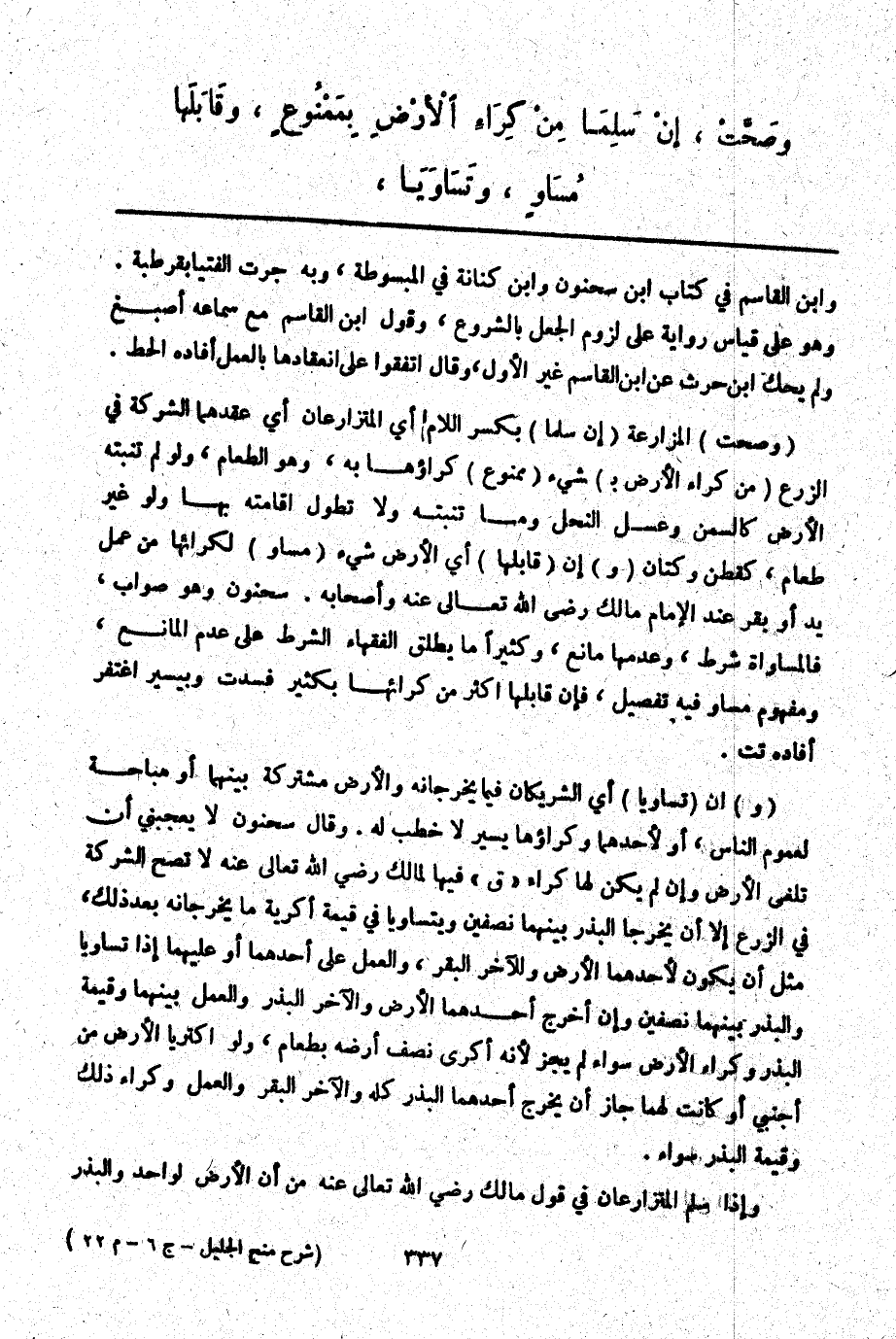 (وَصَحَّتْ) الْمُزَارَعَةُ (إنْ سَلِمَا) بِكَسْرِ اللَّامِ أَيْ الْمُتَزَارِعَانِ أَيْ عَقْدُهُمَا الشَّرِكَةَ فِي الزَّرْعِ (مِنْ كِرَاءِ الْأَرْضِ بِ) شَيْءٍ (مَمْنُوعٍ) كِرَاؤُهَا بِهِ، وَهُوَ الطَّعَامُ، وَلَوْ لَمْ تُنْبِتْهُ الْأَرْضُ كَالسَّمْنِ وَعَسَلِ النَّحْلِ وَمَا تُنْبِتُهُ وَلَا تَطُولُ إقَامَتُهُ بِهَا وَلَوْ غَيْرَ طَعَامٍ، كَقُطْنٍ وَكَتَّانٍ (وَ) إنْ (قَابَلَهَا) أَيْ الْأَرْضَ شَيْءٌ (مُسَاوٍ) لِكِرَائِهَا مِنْ عَمَلِ يَدٍ أَوْ بَقَرٍ عِنْدَ الْإِمَامِ مَالِكٍ - رَضِيَ اللَّهُ تَعَالَى عَنْهُ - وَأَصْحَابِهِ. سَحْنُونٌ وَهُوَ صَوَابٌ. فَالْمُسَاوَاةُ شَرْطٌ، وَعَدَمُهَا مَانِعٌ، وَكَثِيرًا مَا يُطْلِقُ الْفُقَهَاءُ الشَّرْطَ عَلَى عَدَمِ الْمَانِعِ، وَمَفْهُومُ مُسَاوٍ فِيهِ تَفْصِيلٌ، فَإِنْ قَابَلَهَا أَكْثَرُ مِنْ كِرَائِهَا بِكَثِيرٍ فَسَدَتْ وَبِيَسِيرٍ اُغْتُفِرَ أَفَادَهُ تت.