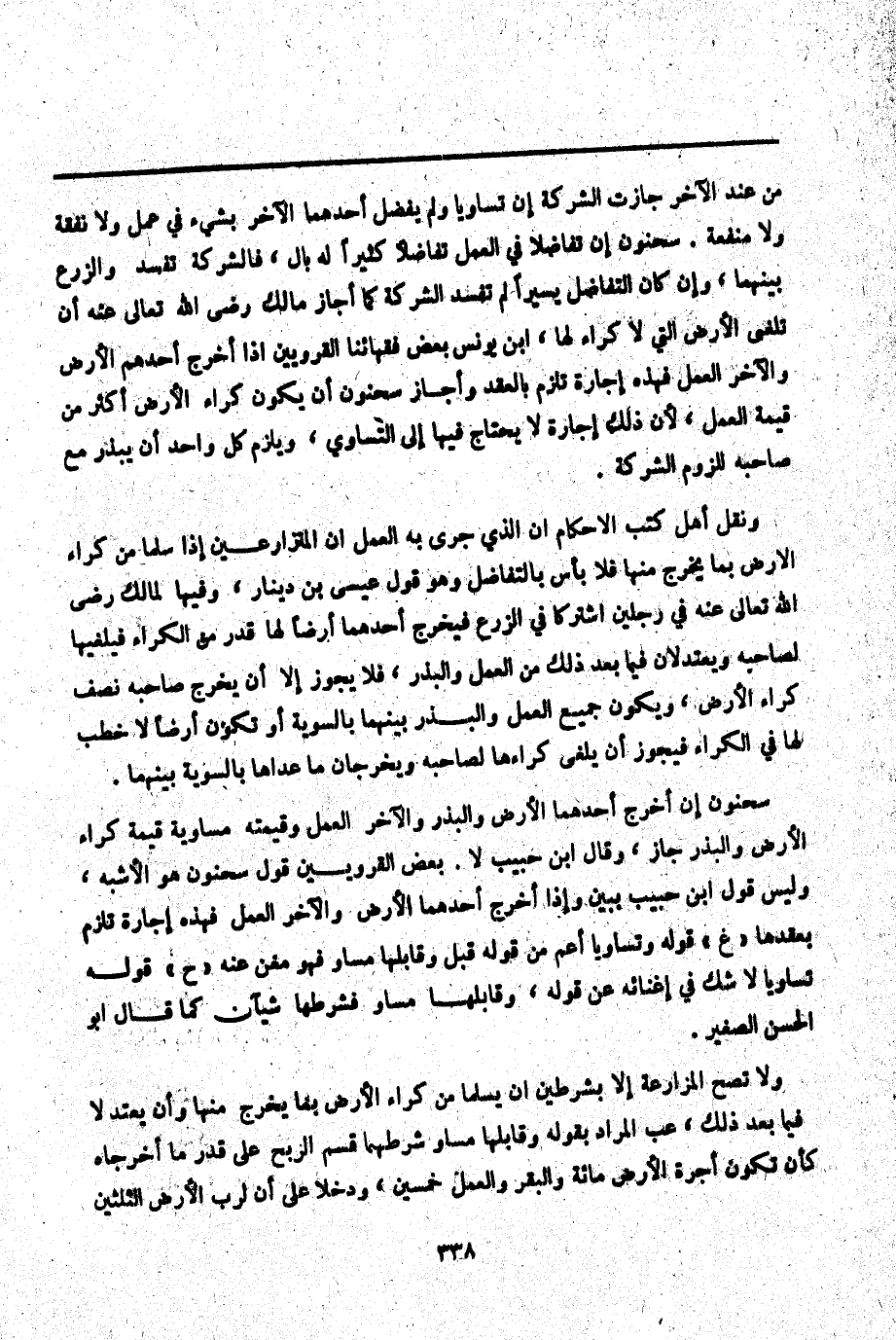 سَحْنُونٌ إنْ أَخْرَجَ أَحَدُهُمَا الْأَرْضَ وَالْبَذْرَ وَالْآخَرُ الْعَمَلَ وَقِيمَتُهُ مُسَاوِيَةٌ قِيمَةُ كِرَاءِ الْأَرْضِ وَالْبَذْرِ جَازَ، وَقَالَ ابْنُ حَبِيبٍ لَا. بَعْضُ الْقَرَوِيِّينَ قَوْلُ سَحْنُونٍ هُوَ الْأَشْبَهُ، وَلَيْسَ قَوْلُ ابْنِ حَبِيبٍ بِبَيِّنٍ وَإِذَا أَخْرَجَ أَحَدُهُمَا الْأَرْضَ وَالْآخَرُ الْعَمَلَ فَهَذِهِ إجَارَةٌ تَلْزَمُ بِعَقْدِهَا " غ " قَوْلُهُ وَتَسَاوَيَا أَعَمُّ مِنْ قَوْلِهِ قَبْلُ وَقَابَلَهَا مُسَاوٍ فَهُوَ مُغْنٍ عَنْهُ " ح " قَوْلُهُ تَسَاوَيَا لَا شَكَّ فِي إغْنَائِهِ عَنْ قَوْلِهِ، وَقَابَلَهَا مُسَاوٍ فَشَرْطُهَا شَيْئَانِ كَمَا قَالَ أَبُو الْحَسَنِ الصَّغِيرُ.