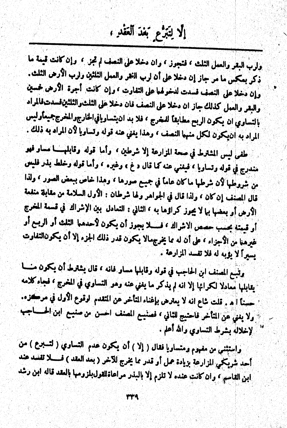 طفي لَيْسَ الْمُشْتَرَطُ فِي صِحَّةِ الْمُزَارَعَةِ إلَّا شَرْطَيْنِ، وَأَمَّا قَوْلُهُ وَقَابَلَهَا مُسَاوٍ فَهُوَ مُنْدَرِجٌ فِي قَوْلِهِ وَتَسَاوَيَا، فَيُغْنِي عَنْهُ كَمَا قَالَ " غ " وَغَيْرُهُ، وَأَمَّا قَوْلُهُ وَخَلْطُ بَذْرٍ فَلَيْسَ مِنْ شُرُوطِهَا لِأَنَّ شَرْطَهَا مَا كَانَ عَامًّا فِي جَمِيعِ صُوَرِهَا، وَهَذَا خَاصٌّ بِبَعْضِ الصُّوَرِ، وَلِذَا قَالَ الْمُصَنِّفُ إنْ كَانَ، وَلِذَا قَالَ فِي الْجَوَاهِرِ وَلَهَا شَرْطَانِ: الْأَوَّلُ السَّلَامَةُ مِنْ مُقَابَلَةِ مَنْفَعَةِ الْأَرْضِ أَوْ بَعْضِهَا بِمَا لَا يَجُوزُ كِرَاؤُهَا بِهِ، الثَّانِي: التَّعَادُلُ بَيْنَ الْإِشْرَاكِ فِي قِسْمَةِ الْمُخْرَجِ أَوْ قِيمَتِهِ بِحَسَبِ حِصَصِ الْإِشْرَاكِ، فَلَا يَجُوزُ أَنْ يَكُونَ لِأَحَدِهِمَا الثُّلُثُ أَوْ الرُّبْعُ أَوْ غَيْرُهُمَا مِنْ الْأَجْزَاءِ، عَلَى أَنَّ لَهُ مِمَّا يَخْرُجُ مَالًا يَكُونُ قَدْرَ ذَلِكَ الْجُزْءِ إلَّا أَنْ يَكُونَ التَّفَاوُتُ يَسِيرًا لَا يُؤْبَهُ لَهُ فَلَا تَفْسُدُ الْمُزَارَعَةُ.