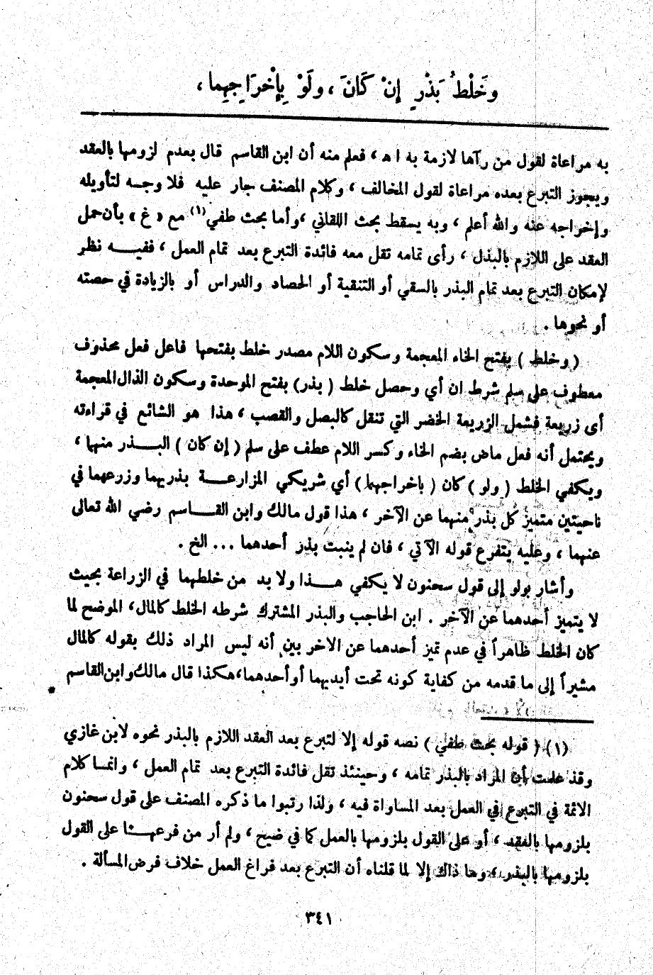 ـــــــــــــــــــــــــــــQبِهِ مُرَاعَاةً لِقَوْلِ مَنْ رَآهَا لَازِمَةً بِهِ. اهـ. فَعُلِمَ مِنْهُ أَنَّ ابْنَ الْقَاسِمِ قَالَ بِعَدَمِ لُزُومِهَا بِالْعَقْدِ وَيَجُوزُ التَّبَرُّعُ بَعْدَهُ مُرَاعَاةً لِقَوْلِ الْمُخَالِفِ، وَكَلَامُ الْمُصَنِّفِ جَارٍ عَلَيْهِ فَلَا وَجْهَ لِتَأْوِيلِهِ وَإِخْرَاجِهِ عَنْهُ وَاَللَّهُ أَعْلَمُ، وَبِهِ يَسْقُطُ بَحْثُ اللَّقَانِيِّ، وَأَمَّا بَحْثُ طفي مَعَ " غ " بِأَنْ حَمَلَ الْعَقْدَ عَلَى اللَّازِمِ بِالْبَذْرِ، رَأَى تَمَامَهُ نَقَلَ مَعَهُ فَائِدَةَ التَّبَرُّعِ بَعْدَ تَمَامِ الْعَمَلِ، فَفِيهِ نَظَرٌ لِإِمْكَانِ التَّبَرُّعِ بَعْدَ تَمَامِ الْبَذْرِ بِالسَّقْيِ أَوْ التَّنْقِيَةِ أَوْ الْحَصَادِ وَالدِّرَاسِ أَوْ بِالزِّيَادَةِ فِي حِصَّتِهِ أَوْ نَحْوِهَا.