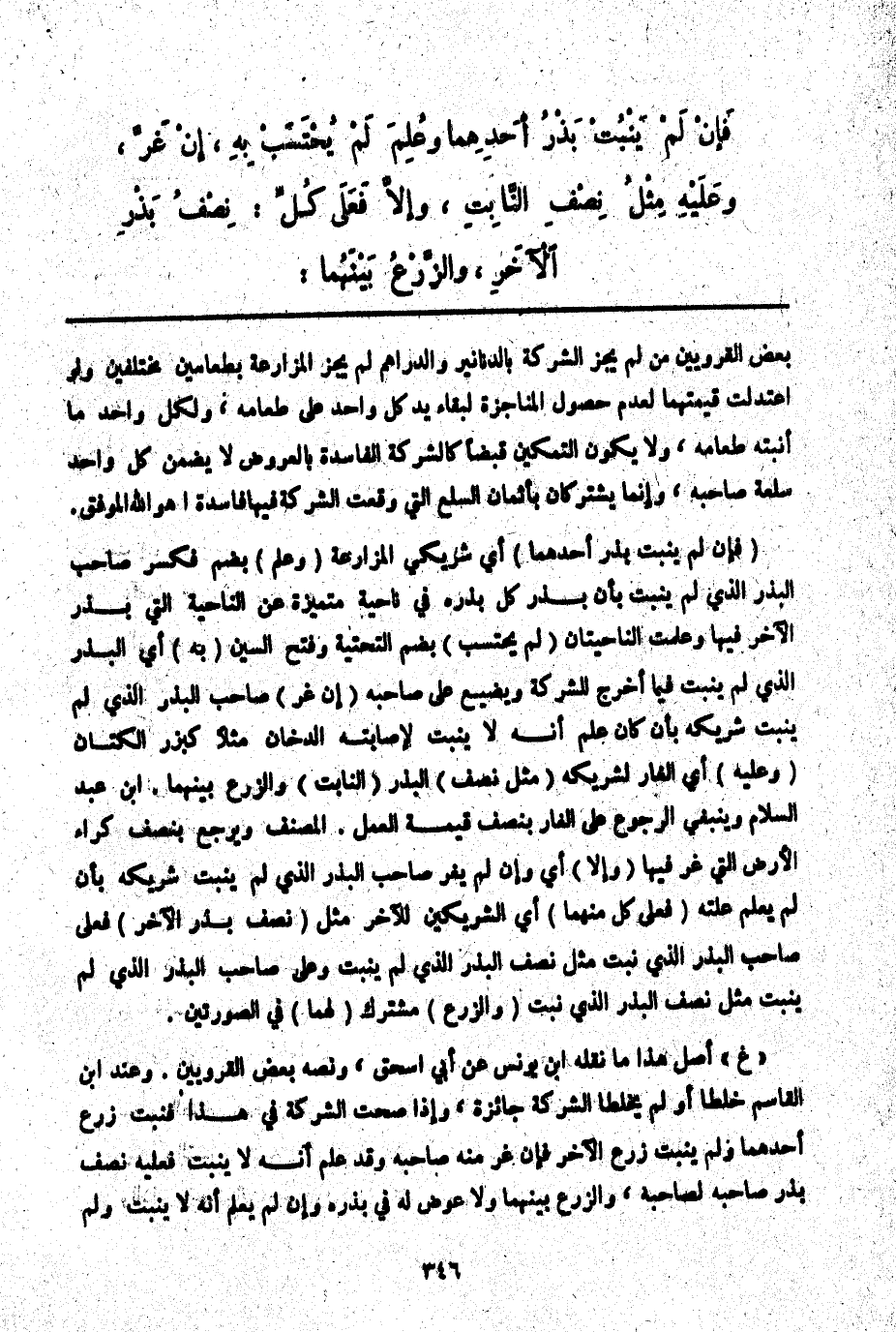 " غ " أَصْلُ هَذَا مَا نَقَلَهُ ابْنُ يُونُسَ عَنْ أَبِي إِسْحَاقَ، وَنَصَّهُ بَعْضُ الْقَرَوِيِّينَ. وَعِنْدَ ابْنِ الْقَاسِمِ خَلَطَا أَوْ لَمْ يَخْلِطَا الشَّرِكَةُ جَائِزَةٌ، وَإِذَا صَحَّتْ الشَّرِكَةُ فِي هَذَا فَنَبَتَ زَرْعُ أَحَدِهِمَا وَلَمْ يَنْبُتْ زَرْعُ الْآخَرِ فَإِنْ غُرَّ مِنْهُ صَاحِبُهُ وَقَدْ عَلِمَ أَنَّهُ لَا يَنْبُتُ فَعَلَيْهِ نِصْفُ بَذْرِ صَاحِبِهِ لِصَاحِبِهِ، وَالزَّرْعُ بَيْنَهُمَا وَلَا عِوَضَ لَهُ فِي بَذْرِهِ وَإِنْ لَمْ يَعْلَمْ أَنَّهُ لَا يَنْبُتُ وَلَمْ