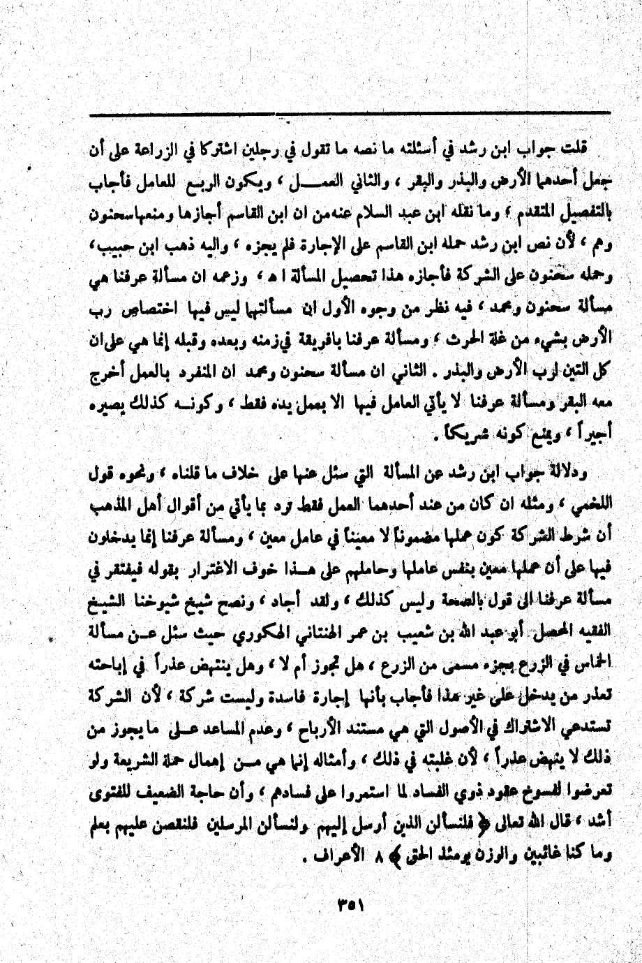 ـــــــــــــــــــــــــــــQقُلْت جَوَابُ ابْنِ رُشْدٍ فِي أَسْئِلَتِهِ مَا نَصُّهُ مَا تَقُولُ فِي رَجُلَيْنِ اشْتَرَكَا فِي الزِّرَاعَةِ عَلَى أَنْ جَعْلَ أَحَدِهِمَا الْأَرْضُ وَالْبَذْرُ وَالْبَقَرَ، وَالثَّانِي الْعَمَلَ، وَيَكُونُ الرُّبْعُ لِلْعَامِلِ فَأَجَابَ بِالتَّفْصِيلِ الْمُتَقَدِّمِ، وَمَا نَقَلَهُ ابْنُ عَبْدِ السَّلَامِ عَنْهُ مِنْ أَنَّ ابْنَ الْقَاسِمِ أَجَازَهَا وَمَنَعَهَا سَحْنُونٌ وَهْمٌ، لِأَنَّ نَصَّ ابْنِ رُشْدٍ حَمَلَهُ ابْنُ الْقَاسِمِ عَلَى الْإِجَارَةِ فَلَمْ يُجِزْهُ، وَإِلَيْهِ ذَهَبَ ابْنُ حَبِيبٍ، وَحَمَلَهُ سَحْنُونٌ عَلَى الشَّرِكَةِ فَأَجَازَهُ هَذَا تَحْصِيلُ الْمَسْأَلَةِ. اهـ. وَزَعْمُهُ أَنَّ مَسْأَلَةَ عُرْفِنَا هِيَ مَسْأَلَةُ سَحْنُونٍ وَمُحَمَّدٍ، فِيهِ نَظَرٌ مِنْ وُجُوهٍ الْأَوَّلُ أَنَّ مَسْأَلَتَهُمَا لَيْسَ فِيهَا اخْتِصَاصُ رَبِّ الْأَرْضِ بِشَيْءٍ مِنْ غَلَّةِ الْحَرْثِ، وَمَسْأَلَةُ عُرْفِنَا بِإِفْرِيقِيَّةَ فِي زَمَنِهِ وَبَعْدَهُ وَقَبْلَهُ إنَّمَا هِيَ عَلَى أَنَّ كُلَّ التِّينِ لِرَبِّ الْأَرْضِ وَالْبَذْرِ. الثَّانِي أَنَّ مَسْأَلَةَ سَحْنُونٍ وَمُحَمَّدٍ أَنَّ الْمُنْفَرِدَ بِالْعَمَلِ أَخْرَجَ مَعَهُ الْبَقَرَ وَمَسْأَلَةُ عُرْفِنَا لَا يَأْتِي الْعَامِلُ فِيهَا إلَّا بِعَمَلِ يَدِهِ فَقَطْ، وَكَوْنُهُ كَذَلِكَ يُصَيِّرُهُ أَجِيرًا، وَيَمْنَعُ كَوْنَهُ شَرِيكًا.