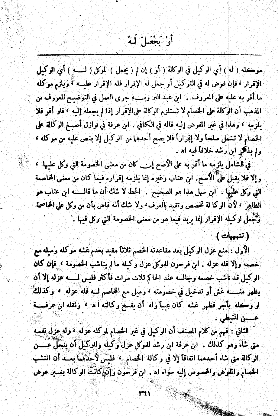 (تَنْبِيهَاتٌ) الْأَوَّلُ: مَنْعُ عَزْلِ الْوَكِيلِ بَعْدَ مُقَاعَدَتِهِ الْخَصْمَ ثَلَاثًا مُقَيَّدٌ بِعَدَمِ غِشِّهِ مُوَكِّلَهُ وَمَيْلِهِ مَعَ خَصْمِهِ وَإِلَّا فَلَهُ عَزْلُهُ. ابْنُ فَرْحُونٍ لِلْمُوَكِّلِ عَزْلُ وَكِيلِهِ مَا لَمْ يُنَاشِبْ الْخُصُومَةَ، فَإِنْ كَانَ الْوَكِيلُ قَدْ نَاشَبَ خَصْمَهُ وَجَالَسَهُ عِنْدَ الْحَاكِمِ ثَلَاثَ مَرَّاتٍ فَأَكْثَرَ فَلَيْسَ لَهُ عَزْلُهُ إلَّا أَنْ يَظْهَرَ مِنْهُ غِشٌّ أَوْ تَدْخِيلٌ فِي خُصُومَتِهِ، وَمَيْلٌ مَعَ الْمُخَاصِمِ لَهُ فَلَهُ عَزْلُهُ؛ وَكَذَلِكَ لَوْ وَكَّلَهُ بِأَجْرٍ فَظَهَرَ غِشُّهُ كَانَ عَيْبًا وَلَهُ أَنْ يَفْسَخَ وَكَالَتَهُ. اهـ. وَنَقَلَهُ ابْنُ عَرَفَةَ عَنْ الْمُتَيْطِيِّ.