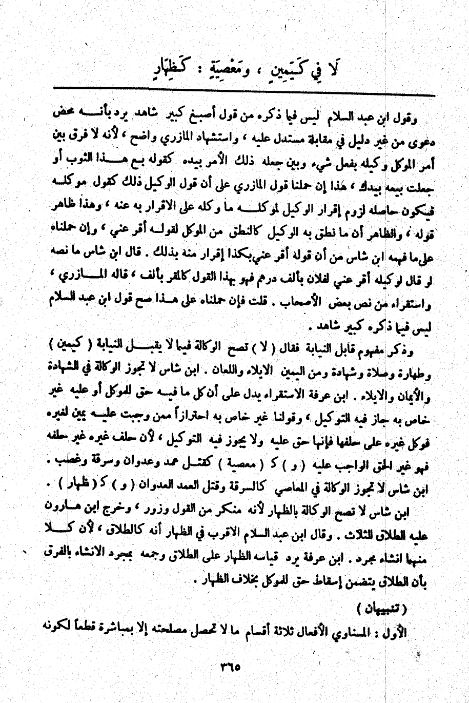ابْنُ شَاسٍ لَا تَصِحُّ الْوَكَالَةُ بِالظِّهَارِ لِأَنَّهُ مُنْكَرٌ مِنْ الْقَوْلِ وَزُورٌ، وَخَرَّجَ ابْنُ هَارُونَ عَلَيْهِ الطَّلَاقَ الثَّلَاثَ. وَقَالَ ابْنُ عَبْدِ السَّلَامِ الْأَقْرَبُ فِي الظِّهَارِ أَنَّهُ كَالطَّلَاقِ لِأَنَّ كُلًّا مِنْهُمَا إنْشَاءٌ مُجَرَّدٌ. ابْنُ عَرَفَةَ يُرَدُّ قِيَاسُهُ الظِّهَارَ عَلَى الطَّلَاقِ وَجَمْعُهُ بِمُجَرَّدِ الْإِنْشَاءِ بِالْفَرْقِ بِأَنَّ الطَّلَاقَ يَتَضَمَّنُ إسْقَاطَ حَقٍّ لِلْمُوَكِّلِ بِخِلَافِ الظِّهَارِ.