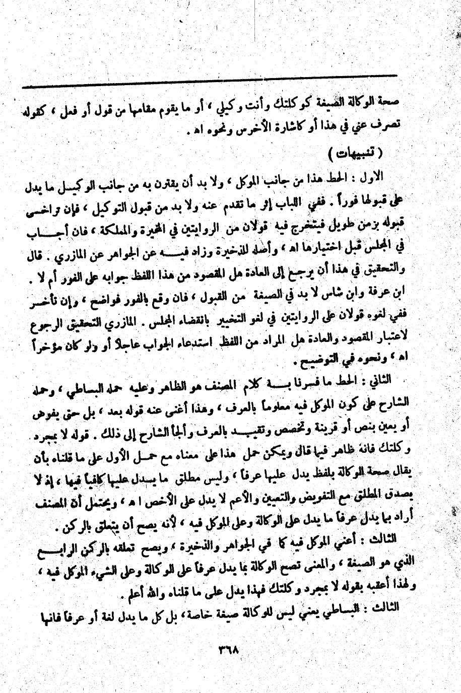 الثَّانِي: الْحَطّ مَا فَسَّرْنَا بِهِ كَلَامَ الْمُصَنِّفِ هُوَ الظَّاهِرُ وَعَلَيْهِ حَمَلَهُ الْبِسَاطِيُّ، وَحَمَلَهُ الشَّارِحُ عَلَى كَوْنِ الْمُوَكَّلِ فِيهِ مَعْلُومًا بِالْعُرْفِ، وَهَذَا أَغْنَى عَنْهُ قَوْلُهُ بَعْدُ، بَلْ حَتَّى يُفَوِّضَ أَوْ يُعَيِّنَ بِنَصٍّ أَوْ قَرِينَةٍ وَتُخَصَّصُ وَتُقَيَّدُ بِالْعُرْفِ وَأَلْجَأَ الشَّارِحَ إلَى ذَلِكَ قَوْلُهُ لَا بِمُجَرَّدِ وَكَّلْتُك فَإِنَّهُ ظَاهِرٌ فِيمَا قَالَ وَيُمْكِنُ حَمْلُ هَذَا عَلَى مَعْنَاهُ مَعَ حَمْلِ الْأَوَّلِ عَلَى مَا قُلْنَاهُ بِأَنْ يُقَالَ صِحَّةُ الْوَكَالَةِ بِلَفْظٍ يَدُلُّ عَلَيْهَا عُرْفًا، وَلَيْسَ مُطْلَقُ مَا يَدُلُّ عَلَيْهَا كَافِيًا فِيهَا، إذْ لَا يَصْدُقُ الْمُطْلَقُ مَعَ التَّفْوِيضِ وَالتَّعْيِينِ وَالْأَعَمُّ لَا يَدُلُّ عَلَى الْأَخَصِّ. اهـ. وَيَحْتَمِلُ أَنَّ الْمُصَنِّفَ أَرَادَ بِمَا يَدُلُّ عُرْفًا مَا يَدُلُّ عَلَى الْوَكَالَةِ وَعَلَى الْمُوَكَّلِ فِيهِ لِأَنَّهُ يَصِحُّ لَأَنْ يَتَعَلَّقَ بِالرُّكْنِ.