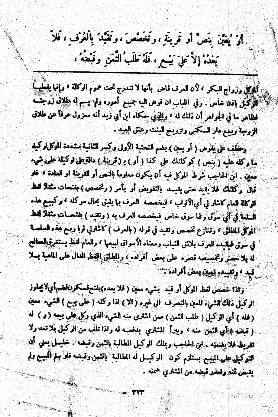 وَعَطَفَ عَلَى يُفَوِّضَ (أَوْ يُعَيِّنَ) بِضَمِّ التَّحْتِيَّةِ الْأُولَى وَكَسْرِ الثَّانِيَةِ مُشَدَّدَةً الْمُوَكِّلُ لِوَكِيلِهِ مَا وَكَّلَهُ عَلَيْهِ (بِنَصٍّ) كَوَكَّلْتُكَ عَلَى كَذَا (أَوْ) بِ (قَرِينَةٍ) دَالَّةٍ عَلَى تَوْكِيلِهِ عَلَى شَيْءٍ مُعَيَّنٍ. ابْنُ الْحَاجِبِ شَرْطُ الْمُوَكَّلِ فِيهِ أَنْ يَكُونَ مَعْلُومًا بِالنَّصِّ أَوْ الْقَرِينَةِ أَوْ الْعَادَةِ، فَلَوْ قَالَ وَكَّلْتُك فَلَا يُقَيَّدُ حَتَّى يُقَيِّدَ بِالتَّفْوِيضِ أَوْ بِأَمْرٍ (وَتَخَصَّصَ) بِفَتَحَاتِ مُثَقَّلًا لَفْظُ الْوَكَالَةِ الْعَامِّ كَاشْتَرِ لِي أَيْ الْأَثْوَابَ، فَيُخَصِّصُهُ الْعُرْفُ بِمَا يَلِيقُ بِحَالِ مُوَكِّلِهِ، وَكَبَيْعِ هَذِهِ السِّلْعَةِ فِي أَيِّ سُوقٍ وَلَهَا سُوقٌ خَاصٌّ فَيُخَصِّصُهُ الْعُرْفُ بِهِ (وَتَقَيَّدَ) بِفَتَحَاتٍ مُثَقَّلًا لَفْظُ الْمُوَكِّلِ الْمُطْلَقِ، وَتَنَازَعَ تَخَصَّصَ وَتَقَيَّدَ فِي قَوْلِهِ (بِالْعُرْفِ) كَاشْتَرِ لِي ثَوْبًا وَبِعْ هَذِهِ السِّلْعَةَ فِي سُوقٍ فَيُقَيِّدُهُ الْعُرْفُ بِلَائِقِ الثِّيَابِ وَمُعْتَادِ الْأَسْوَاقِ لِبَيْعِهَا وَالْعَامُّ لَفْظٌ يَسْتَغْرِقُ الصَّالِحَ لَهُ بِلَا حَصْرِ وَتَخْصِيصُهُ قَصْرُهُ عَلَى بَعْضِ أَفْرَادِهِ وَالْمُطْلَقُ اللَّفْظُ الدَّالُّ عَلَى الْمَاهِيَّةِ بِلَا قَيْدٍ، وَتَقْيِيدُهُ تَعْيِينُ بَعْضِ أَفْرَادِهِ.