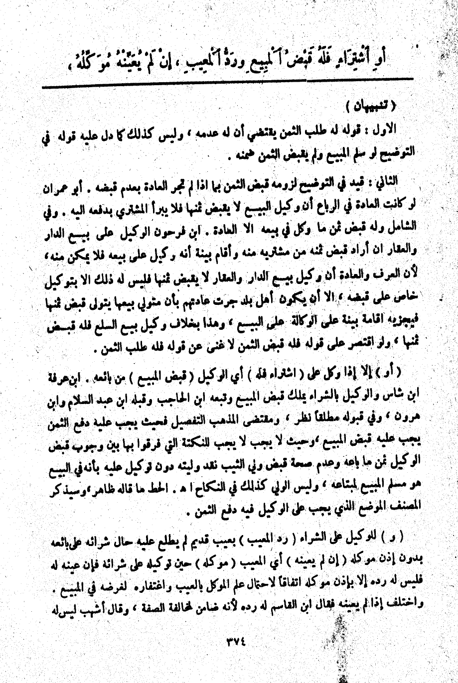 الثَّانِي: قَيَّدَ فِي التَّوْضِيحِ لُزُومَهُ قَبْضَ الثَّمَنِ بِمَا إذَا لَمْ تَجْرِ الْعَادَةُ بِعَدَمِ قَبْضِهِ. أَبُو عِمْرَانَ لَوْ كَانَتْ الْعَادَةُ فِي الرِّبَاعِ أَنَّ وَكِيلَ الْبِيَعِ لَا يَقْبِضُ ثَمَنَهَا فَلَا يَبْرَأُ الْمُشْتَرِي بِدَفْعِهِ إلَيْهِ. وَفِي الشَّامِلِ وَلَهُ قَبْضُ ثَمَنِ مَا وُكِّلَ فِي بَيْعِهِ إلَّا الْعَادَةَ. ابْنُ فَرْحُونٍ الْوَكِيلُ عَلَى بَيْعِ الدَّارِ وَالْعَقَارِ إنْ أَرَادَ قَبْضَ ثَمَنِهِ مِنْ مُشْتَرِيهِ مِنْهُ وَأَقَامَ بَيِّنَةً أَنَّهُ وَكِيلٌ عَلَى بَيْعِهِ فَلَا يُمَكَّنُ مِنْهُ، لِأَنَّ الْعُرْفَ وَالْعَادَةَ أَنَّ وَكِيلَ بَيْعِ الدَّارِ وَالْعَقَارِ لَا يَقْبِضُ ثَمَنَهَا فَلَيْسَ لَهُ ذَلِكَ إلَّا بِتَوْكِيلٍ خَاصٍّ عَلَى قَبْضِهِ، إلَّا أَنْ يَكُونَ أَهْلُ بَلَدٍ جَرَتْ عَادَتُهُمْ بِأَنَّ مُتَوَلِّي بَيْعِهَا يَتَوَلَّى قَبْضَ ثَمَنِهَا فَيُجْزِئُهُ إقَامَةُ بَيِّنَةٍ عَلَى الْوَكَالَةِ عَلَى الْبَيْعِ، وَهَذَا بِخِلَافِ وَكِيلِ بَيْعِ السِّلْعِ فَلَهُ قَبْضُ ثَمَنِهَا، وَلَوْ اقْتَصَرَ عَلَى قَوْلِهِ فَلَهُ قَبْضُ الثَّمَنِ لَا غِنَى عَنْ قَوْلِهِ فَلَهُ طَلَبُ الثَّمَنِ.