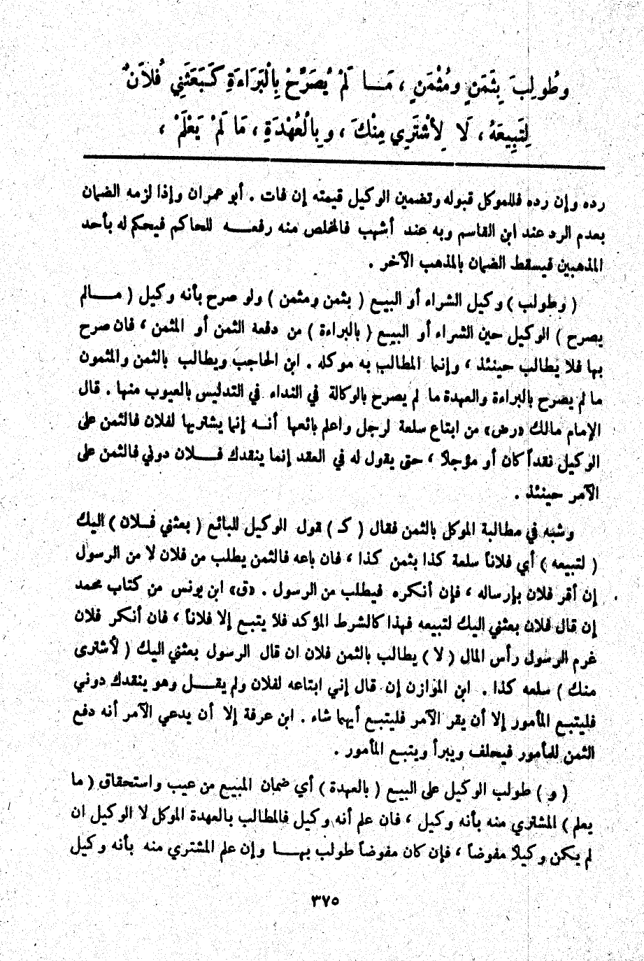 (وَطُولِبَ) وَكِيلُ الشِّرَاءِ أَوْ الْبَيْعِ (بِثَمَنٍ وَمُثْمَنٍ) وَلَوْ صَرَّحَ بِأَنَّهُ وَكِيلٌ (مَا لَمْ يُصَرِّحْ) الْوَكِيلُ حِينَ الشِّرَاءِ أَوْ الْبَيْعِ (بِالْبَرَاءَةِ) مِنْ دَفْعِهِ الثَّمَنَ أَوْ الْمُثْمَنَ، فَإِنْ صَرَّحَ بِهَا فَلَا يُطَالِبُ حِينَئِذٍ، وَإِنَّمَا الْمَطَالِبُ بِهِ مُوَكِّلُهُ. ابْنُ الْحَاجِبِ وَيُطَالِبُ بِالثَّمَنِ وَالْمَثْمُونِ مَا لَمْ يُصَرِّحْ بِالْبَرَاءَةِ وَالْعُهْدَةِ مَا لَمْ يُصَرِّحْ بِالْوَكَالَةِ فِي النِّدَاءِ فِي التَّدْلِيسِ بِالْعُيُوبِ مِنْهَا. قَالَ الْإِمَامُ مَالِكٌ " - رَضِيَ اللَّهُ تَعَالَى عَنْهُ - " مَنْ ابْتَاعَ سِلْعَةً لِرَجُلٍ وَأَعْلَمَ بَائِعَهَا أَنَّهُ إنَّمَا يَشْتَرِيهَا لِفُلَانٍ فَالثَّمَنُ عَلَى الْوَكِيلِ نَقْدًا كَانَ أَوْ مُؤَجَّلًا، حَتَّى يَقُولَ لَهُ فِي الْعَقْدِ إنَّمَا يَنْقُدُك فُلَانٌ دُونِي فَالثَّمَنُ عَلَى الْآمِرِ حِينَئِذٍ.
