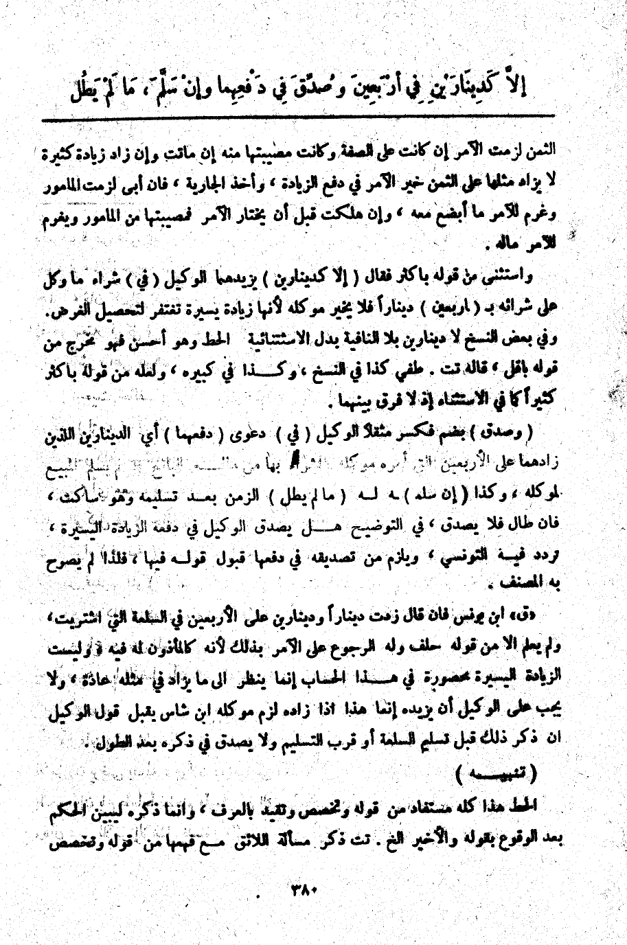 وَاسْتَثْنَى مِنْ قَوْلِهِ بِأَكْثَرَ فَقَالَ (إلَّا كَدِينَارَيْنِ) يَزِيدُهُمَا الْوَكِيلُ (فِي) شِرَاءِ مَا وُكِّلَ عَلَى شِرَائِهِ بِ (أَرْبَعِينَ) دِينَارًا فَلَا يُخَيَّرُ مُوَكِّلُهُ لِأَنَّهَا زِيَادَةٌ يَسِيرَةٌ تُغْتَفَرُ لِتَحْصِيلِ الْغَرَضِ. وَفِي بَعْضِ النُّسَخِ لَا دِينَارَيْنِ بِلَا النَّافِيَةِ بَدَلَ الِاسْتِثْنَائِيَّة الْحَطّ وَهُوَ أَحْسَنُ فَهُوَ مُخْرِجٌ مِنْ قَوْلِهِ بِأَقَلَّ، قَالَهُ تت. طفي كَذَا فِي النُّسَخِ، وَكَذَا فِي كَبِيرِهِ، وَلَعَلَّهُ مِنْ قَوْلِهِ بِأَكْثَرَ كَثِيرًا كَمَا فِي الِاسْتِثْنَاءِ إذْ لَا فَرْقَ بَيْنَهُمَا.