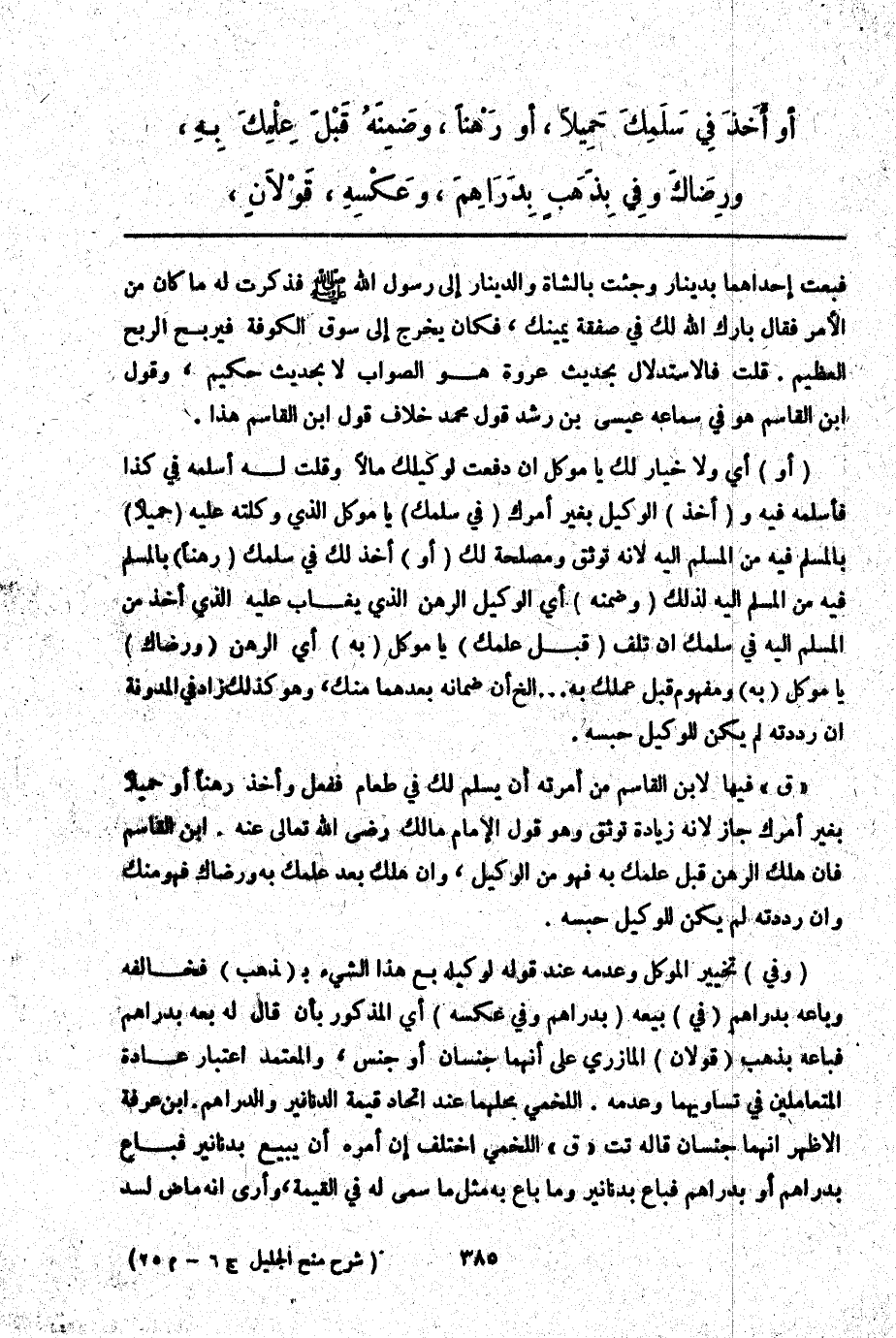(أَوْ) أَيْ وَلَا خِيَارَ لَك يَا مُوَكِّلُ إنْ دَفَعْت لِوَكِيلِك مَالًا وَقُلْت لَهُ أَسْلِمْهُ فِي كَذَا فَأَسْلَمَهُ فِيهِ وَ (أَخَذَ) الْوَكِيلُ بِغَيْرِ أَمْرِك (فِي سَلَمِك) يَا مُوَكِّلُ الَّذِي وَكَّلْته عَلَيْهِ (حَمِيلًا) بِالْمُسْلَمِ فِيهِ مِنْ الْمُسْلَمِ إلَيْهِ لِأَنَّهُ تَوَثُّقٌ وَمَصْلَحَةٌ لَك (أَوْ) أَخَذَ لَك فِي سَلَمِك (رَهْنًا) بِالْمُسْلَمِ فِيهِ مِنْ الْمُسْلَمِ إلَيْهِ لِذَلِكَ (وَضَمِنَهُ) أَيْ الْوَكِيلُ الرَّهْنَ الَّذِي يُغَابُ عَلَيْهِ الَّذِي أَخَذَ مِنْ الْمُسْلَمِ إلَيْهِ فِي سَلَمِك إنْ تَلِفَ (قَبْلَ عِلْمِك) يَا مُوَكِّلُ (بِهِ) أَيْ الرَّهْنِ (وَرِضَاك) يَا مُوَكِّلُ (بِهِ) وَمَفْهُومُ قَبْلَ عِلْمِكَ بِهِ. . . إلَخْ أَنَّ ضَمَانَهُ بَعْدَهُمَا مِنْك، وَهُوَ كَذَلِكَ زَادَ فِي الْمُدَوَّنَةِ إنْ رَدَدْته لَمْ يَكُنْ لِلْوَكِيلِ حَبْسُهُ.