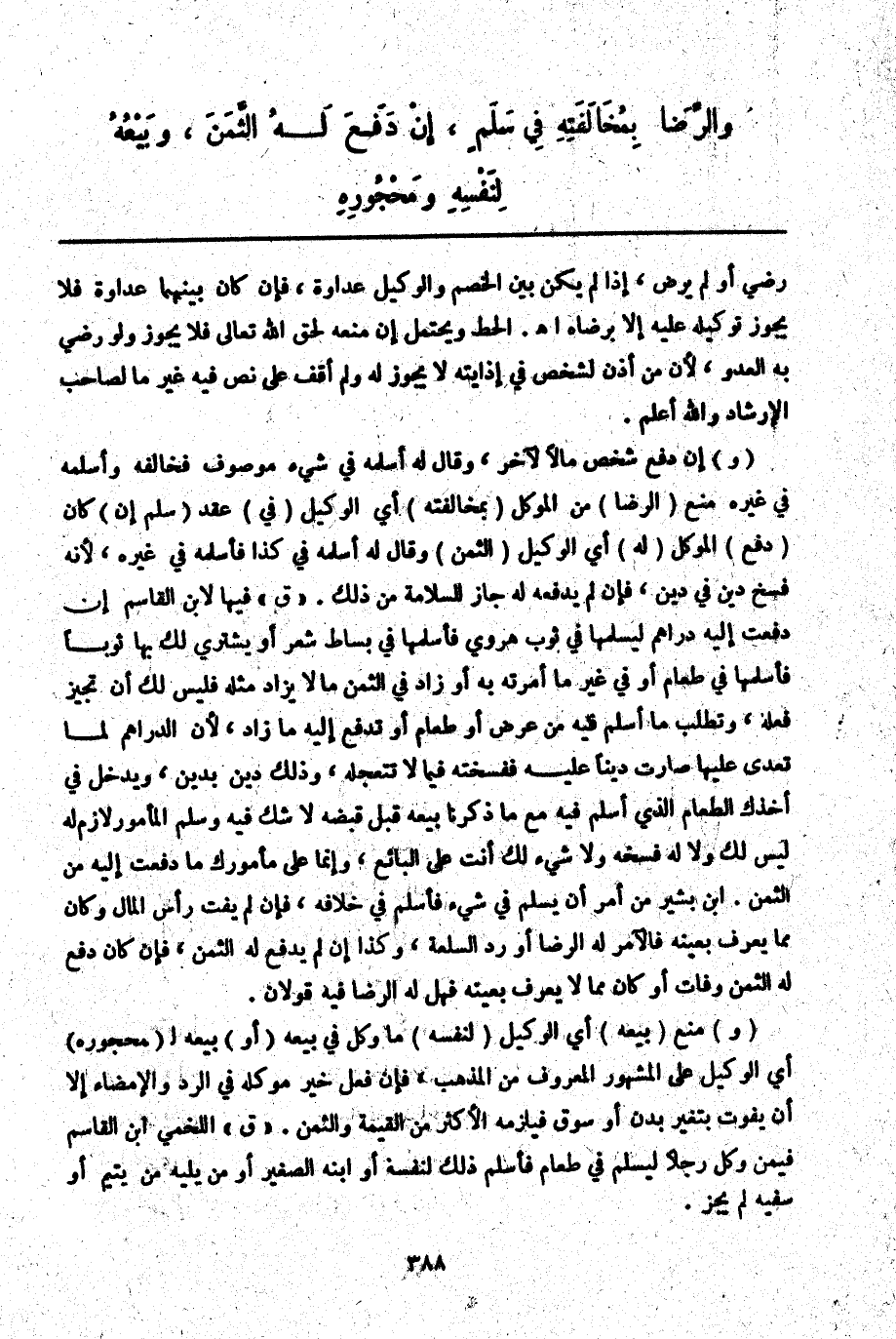 (وَ) إنْ دَفَعَ شَخْصٌ مَالًا لِآخَرَ، وَقَالَ لَهُ أَسْلِمْهُ فِي شَيْءٍ مَوْصُوفٍ فَخَالَفَهُ وَأَسْلَمَهُ فِي غَيْرِهِ مُنِعَ (الرِّضَا) مِنْ الْمُوَكِّلِ (بِمُخَالَفَتِهِ) أَيْ الْوَكِيلِ (فِي) عَقْدِ (سَلَمٍ إنْ) كَانَ (دَفَعَ) الْمُوَكِّلُ (لَهُ) أَيْ الْوَكِيلِ (الثَّمَنَ) وَقَالَ لَهُ أَسْلِمْهُ فِي كَذَا فَأَسْلَمَهُ فِي غَيْرِهِ لِأَنَّهُ فَسْخُ دَيْنٍ فِي دَيْنٍ، فَإِنْ لَمْ يَدْفَعْهُ لَهُ جَازَ لِلسَّلَامَةِ مِنْ ذَلِكَ. " ق " فِيهَا لِابْنِ الْقَاسِمِ إنْ دَفَعْت إلَيْهِ دَرَاهِمَ لِيُسْلِمَهَا فِي ثَوْبٍ هَرَوِيٍّ فَأَسْلَمَهَا فِي بِسَاطِ شَعْرٍ أَوْ يَشْتَرِيَ لَك بِهَا ثَوْبًا فَأَسْلَمَهَا فِي طَعَامٍ أَوْ فِي غَيْرِ مَا أَمَرْته بِهِ أَوْ زَادَ فِي الثَّمَنِ مَا لَا يُزَادُ مِثْلُهُ فَلَيْسَ لَك أَنْ تُجِيزَ فِعْلَهُ، وَتَطْلُبَ مَا أَسْلَمَ فِيهِ مِنْ عَرْضٍ أَوْ طَعَامٍ أَوْ تَدْفَعَ إلَيْهِ مَا زَادَ لِأَنَّ الدَّرَاهِمَ لَمَّا تَعَدَّى عَلَيْهَا صَارَتْ دَيْنًا عَلَيْهِ فَفَسَخَتْهُ فِيمَا لَا تَتَعَجَّلْهُ، وَذَلِكَ دَيْنٌ بِدَيْنٍ، وَيَدْخُلُ فِي أَخْذِك الطَّعَامَ الَّذِي أَسْلَمَ فِيهِ مَعَ مَا ذَكَرْنَا بَيْعهُ قَبْلَ قَبْضِهِ لَا شَكَّ فِيهِ وَسَلَمُ الْمَأْمُورِ لَازِمٌ لَهُ لَيْسَ لَك وَلَا لَهُ فَسْخُهُ وَلَا شَيْءَ لَك أَنْتَ عَلَى الْبَائِعِ، وَإِنَّمَا عَلَى مَأْمُورِك مَا دَفَعْت إلَيْهِ مِنْ الثَّمَنِ. ابْنُ بَشِيرٍ مَنْ أُمِرَ أَنْ يُسْلِمَ فِي شَيْءٍ فَأَسْلَمَ فِي خِلَافِهِ، فَإِنْ لَمْ يَفُتْ رَأْسُ الْمَالِ وَكَانَ مِمَّا يُعْرَفُ بِعَيْنِهِ فَالْآمِرُ لَهُ الرِّضَا أَوْ رَدُّ السِّلْعَةِ، وَكَذَا إنْ لَمْ يَدْفَعْ لَهُ الثَّمَنَ، فَإِنْ كَانَ دَفَعَ لَهُ الثَّمَنَ وَفَاتَ أَوْ كَانَ مِمَّا لَا يُعْرَفُ بِعَيْنِهِ فَهَلْ لَهُ الرِّضَا فِيهِ قَوْلَانِ.