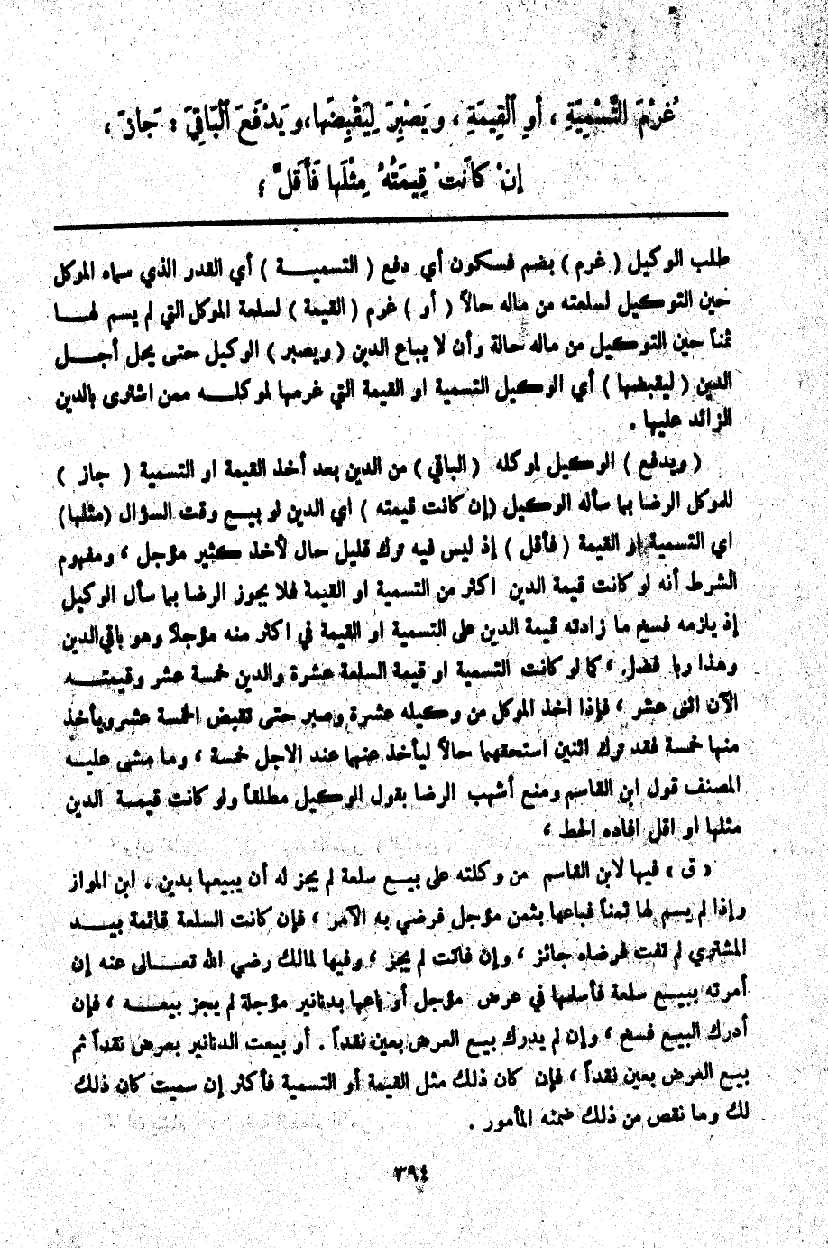 ـــــــــــــــــــــــــــــQطَلَبَ الْوَكِيلُ (غُرْمَ) بِضَمٍّ فَسُكُونٍ أَيْ دَفْعَ (التَّسْمِيَةِ) أَيْ الْقَدْرِ الَّذِي سَمَّاهُ الْمُوَكِّلُ حِينَ التَّوْكِيلِ لِسِلْعَتِهِ مِنْ مَالِهِ حَالًّا (أَوْ) غُرْمَ (الْقِيمَةِ) لِسِلْعَةِ الْمُوَكِّلِ الَّتِي لَمْ يُسَمِّ لَهَا ثَمَنًا حِينَ التَّوْكِيلِ مِنْ مَالِهِ حَالَّةً وَأَنْ لَا يُبَاعَ الدَّيْنُ (وَيَصْبِرَ) الْوَكِيلُ حَتَّى يَحِلَّ أَجَلُ الدَّيْنِ (لِيَقْبِضَهَا) أَيْ الْوَكِيلُ التَّسْمِيَةَ أَوْ الْقِيمَةَ الَّتِي غَرِمَهَا لِمُوَكِّلِهِ مِمَّنْ اشْتَرَى بِالدَّيْنِ الزَّائِدِ عَلَيْهَا.
