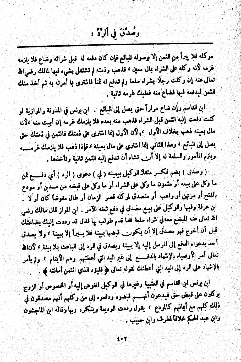 ابْنُ يُونُسَ ابْنُ الْقَاسِمِ فِي الْعُتْبِيَّةِ وَغَيْرِهَا فِي الْوَكِيلِ الْمُفَوَّضِ إلَيْهِ أَوْ الْمَخْصُوصِ أَوْ الزَّوْجِ يُوَكِّلُونَ عَلَى قَبْضِ حَقٍّ فَيَدَّعُونَ أَنَّهُمْ قَبَضُوهُ وَدَفَعُوهُ إلَى مَنْ وَكَّلَهُمْ أَنَّهُمْ مُصَدَّقُونَ فِي ذَلِكَ كُلُّهُمْ مَعَ أَيْمَانِهِمْ كَالْمُودَعِ، يَقُولُ رَدَدْت الْوَدِيعَةَ وَيُنْكِرُهُ رَبُّهَا وَقَالَهُ ابْنُ الْمَاجِشُونِ وَابْنُ عَبْدِ الْحَكَمِ خِلَافًا لِمُطَرِّفٍ وَابْنِ حَبِيبٍ.