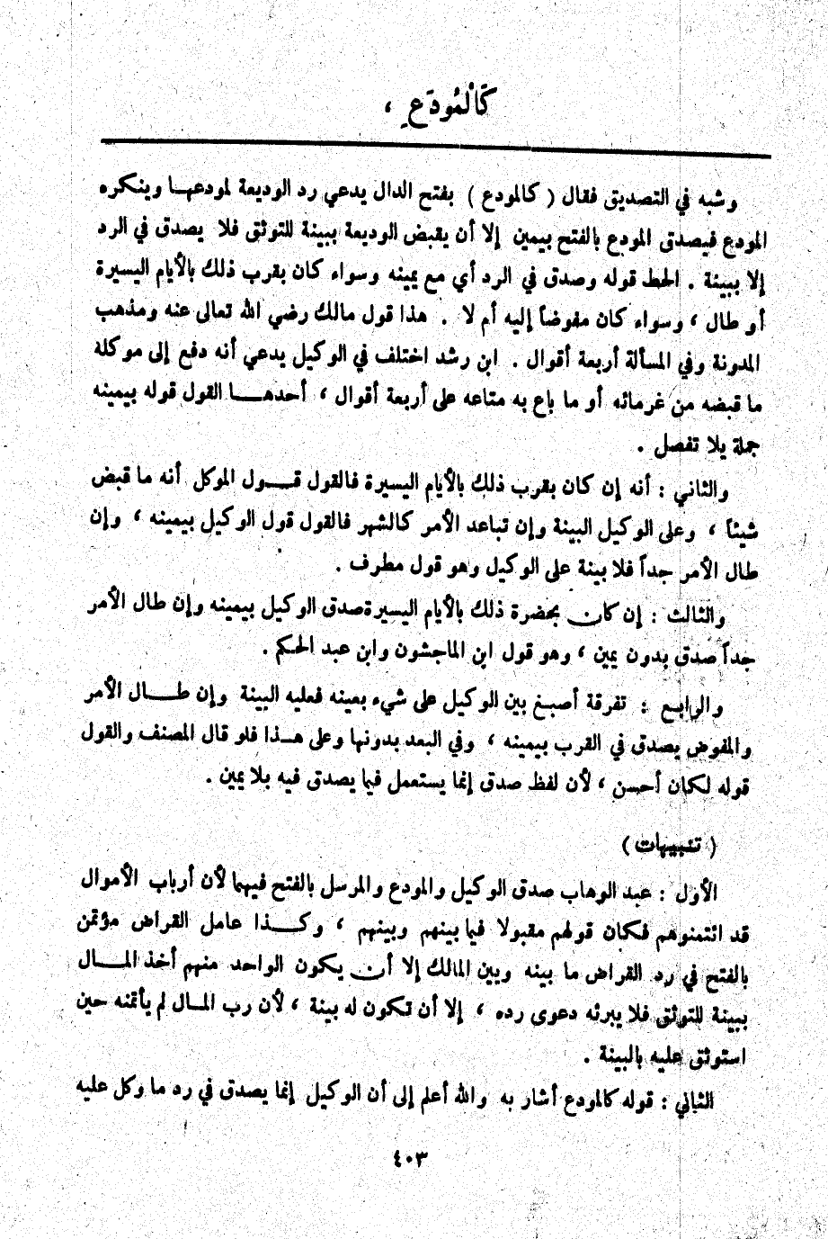 ـــــــــــــــــــــــــــــQوَشَبَّهَ فِي التَّصْدِيقِ فَقَالَ (كَالْمُودَعِ) بِفَتْحِ الدَّالِ يَدَّعِي رَدَّ الْوَدِيعَةِ لِمُودِعِهَا وَيُنْكِرُهُ الْمُودِعُ فَيُصَدَّقُ الْمُودَعُ بِالْفَتْحِ بِيَمِينٍ إلَّا أَنْ يَقْبِضَ الْوَدِيعَةَ بِبَيِّنَةٍ لِلتَّوَثُّقِ فَلَا يُصَدَّقُ فِي الرَّدِّ إلَّا بِبَيِّنَةٍ. الْحَطّ قَوْلُهُ وَصُدِّقَ فِي الرَّدِّ أَيْ مَعَ يَمِينِهِ وَسَوَاءٌ كَانَ بِقُرْبِ ذَلِكَ بِالْأَيَّامِ الْيَسِيرَةِ أَوْ طَالَ، وَسَوَاءٌ كَانَ مُفَوَّضًا إلَيْهِ أَمْ لَا. هَذَا قَوْلُ مَالِكٍ - رَضِيَ اللَّهُ تَعَالَى عَنْهُ - وَمَذْهَبُ الْمُدَوَّنَةِ وَفِي الْمَسْأَلَةِ أَرْبَعَةُ أَقْوَالٍ. ابْنُ رُشْدٍ اُخْتُلِفَ فِي الْوَكِيلِ يَدَّعِي أَنَّهُ دَفَعَ إلَى مُوَكِّلِهِ مَا قَبَضَهُ مِنْ غُرَمَائِهِ أَوْ مَا بَاعَ بِهِ مَتَاعَهُ عَلَى أَرْبَعَةِ أَقْوَالٍ: أَحَدُهَا الْقَوْلُ قَوْلُهُ بِيَمِينِهِ جُمْلَةً بِلَا تَفْصِيلٍ. وَالثَّانِي: أَنَّهُ إنْ كَانَ بِقُرْبِ ذَلِكَ بِالْأَيَّامِ الْيَسِيرَةِ فَالْقَوْلُ قَوْلُ الْمُوَكِّلِ أَنَّهُ مَا قَبَضَ شَيْئًا، وَعَلَى الْوَكِيلِ الْبَيِّنَةُ وَإِنْ تَبَاعَدَ الْأَمْرُ كَالشَّهْرِ فَالْقَوْلُ قَوْلُ الْوَكِيلِ بِيَمِينِهِ، وَإِنْ طَالَ الْأَمْرُ جِدًّا فَلَا بَيِّنَةَ عَلَى الْوَكِيلِ وَهُوَ قَوْلُ مُطَرِّفٍ.