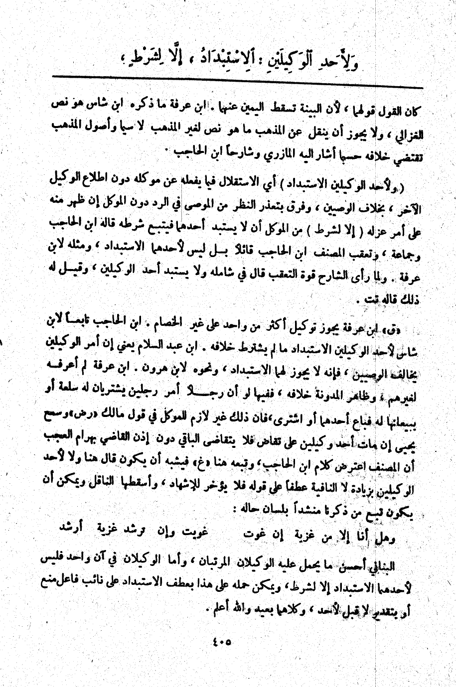 " ق " ابْنُ عَرَفَةَ يَجُوزُ تَوْكِيلُ أَكْثَرَ مِنْ وَاحِدٍ عَلَى غَيْرِ الْخِصَامِ. ابْنُ الْحَاجِبِ تَابِعًا لِابْنِ شَاسٍ لِأَحَدِ الْوَكِيلَيْنِ الِاسْتِبْدَادُ مَا لَمْ يَشْتَرِطْ خِلَافَهُ. ابْنُ عَبْدِ السَّلَامِ يَعْنِي أَنَّ أَمْرَ الْوَكِيلَيْنِ يُخَالِفُ الْوَصِيَّيْنِ، فَإِنَّهُ لَا يَجُوزُ لَهُمَا الِاسْتِبْدَادُ، وَنَحْوُهُ لِابْنِ هَارُونَ. ابْنُ عَرَفَةَ لَمْ أَعْرِفْهُ لِغَيْرِهِمْ وَظَاهِرُ الْمُدَوَّنَةِ خِلَافُهُ، فَفِيهَا لَوْ أَنَّ رَجُلًا أَمَرَ رَجُلَيْنِ يَشْتَرِيَانِ لَهُ سِلْعَةً أَوْ يَبِيعَانِهَا لَهُ فَبَاعَ أَحَدُهُمَا أَوْ اشْتَرَى، فَإِنَّ ذَلِكَ غَيْرُ لَازِمٍ لِلْمُوَكِّلِ فِي قَوْلِ مَالِكٍ " - رَضِيَ اللَّهُ تَعَالَى عَنْهُ - " وَسَمِعَ يَحْيَى إنْ مَاتَ أَحَدُ وَكِيلَيْنِ عَلَى تَقَاضٍ فَلَا يَتَقَاضَى الْبَاقِي دُونَ إذْنِ الْقَاضِي بَهْرَامَ الْعَجَبُ أَنَّ الْمُصَنِّفَ اعْتَرَضَ كَلَامَ ابْنِ الْحَاجِبِ، وَتَبِعَهُ هُنَا " غ " فَيُشْبِهُ أَنْ يَكُونَ قَالَ هُنَا وَلَا لِأَحَدِ الْوَكِيلَيْنِ بِزِيَادَةِ لَا النَّافِيَةِ عَطْفًا عَلَى قَوْلِهِ فَلَا يُؤَخِّرُ لِلْإِشْهَادِ، وَأَسْقَطَهَا النَّاقِلُ وَيُمْكِنُ أَنْ يَكُونَ تَبِعَ مَنْ ذَكَرْنَا مُنْشِدًا بِلِسَانِ حَالِهِ: