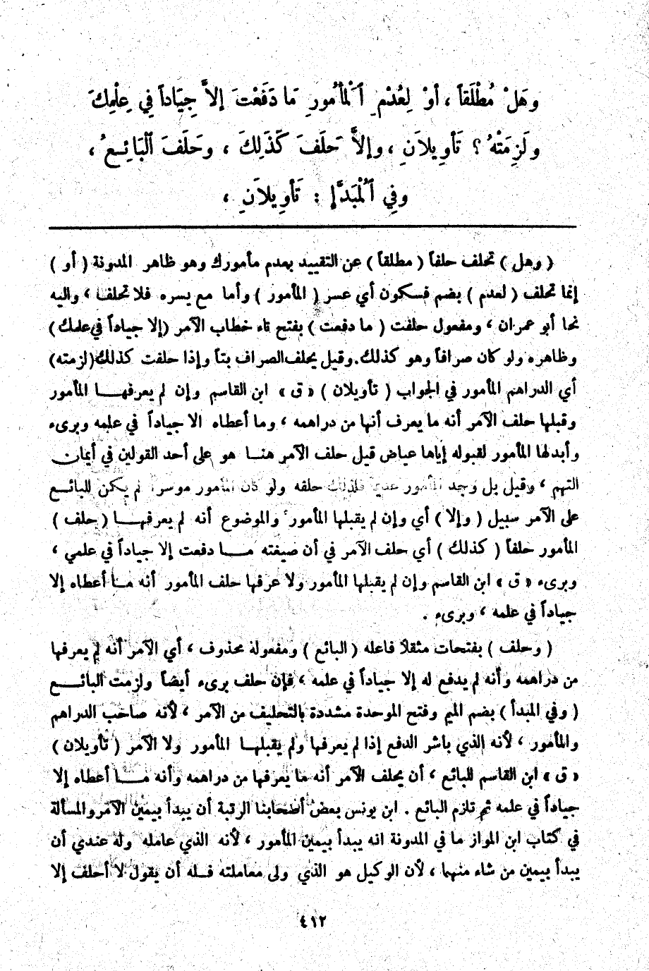 وَهَلْ مُطْلَقًا، أَوْ لِعُدْمِ الْمَأْمُورِ مَا دَفَعْتَ إلَّا جِيَادًا فِي عِلْمِك وَلَزِمَتْهُ؟ تَأْوِيلَانِ، وَإِلَّا حَلَفَ كَذَلِكَ، وَحَلَّفَ الْبَائِعُ، وَفِي الْمُبَدَّإِ: تَأْوِيلَانِ