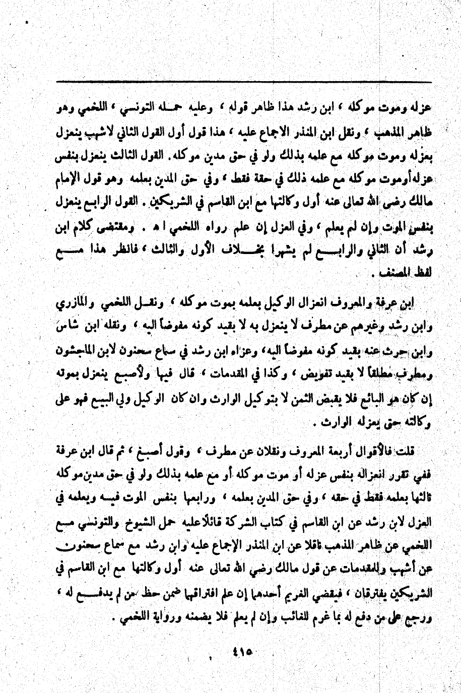 ـــــــــــــــــــــــــــــQعَزْلِهِ وَمَوْتِ مُوَكِّلِهِ ابْنُ رُشْدٍ هَذَا ظَاهِرُ قَوْلِهِ: وَعَلَيْهِ حَمَلَهُ التُّونُسِيُّ اللَّخْمِيُّ وَهُوَ ظَاهِرُ الْمَذْهَبِ، وَنَقَلَ ابْنُ الْمُنْذِرِ الْإِجْمَاعَ عَلَيْهِ، هَذَا قَوْلٌ أَوَّلُ. الْقَوْلُ الثَّانِي لِأَشْهَبَ يَنْعَزِلُ بِعَزْلِهِ وَمَوْتِ مُوَكِّلِهِ مَعَ عِلْمِهِ بِذَلِكَ وَلَوْ فِي حَقِّ مَدِينِ مُوَكِّلِهِ. الْقَوْلُ الثَّالِثُ يَنْعَزِلُ بِنَفْسِ عَزْلِهِ أَوْ مَوْتِ مُوَكِّلِهِ مَعَ عِلْمِهِ ذَلِكَ فِي حَقِّهِ فَقَطْ، وَفِي حَقِّ الْمَدِينِ بِعِلْمِهِ وَهُوَ قَوْلُ الْإِمَامِ مَالِكٍ - رَضِيَ اللَّهُ تَعَالَى عَنْهُ - أَوَّلَ وَكَالَتِهَا مَعَ ابْنِ الْقَاسِمِ فِي الشَّرِيكَيْنِ. الْقَوْلُ الرَّابِعُ يَنْعَزِلُ بِنَفْسِ الْمَوْتِ وَإِنْ لَمْ يَعْلَمْ، وَفِي الْعَزْلِ إنْ عَلِمَ رَوَاهُ اللَّخْمِيُّ اهـ. وَمُقْتَضَى كَلَامِ ابْنِ رُشْدٍ أَنَّ الثَّانِيَ وَالرَّابِعَ لَمْ يُشْهَرَا بِخِلَافِ الْأَوَّلِ وَالثَّالِثِ، فَانْظُرْ هَذَا مَعَ لَفْظِ الْمُصَنِّفِ.