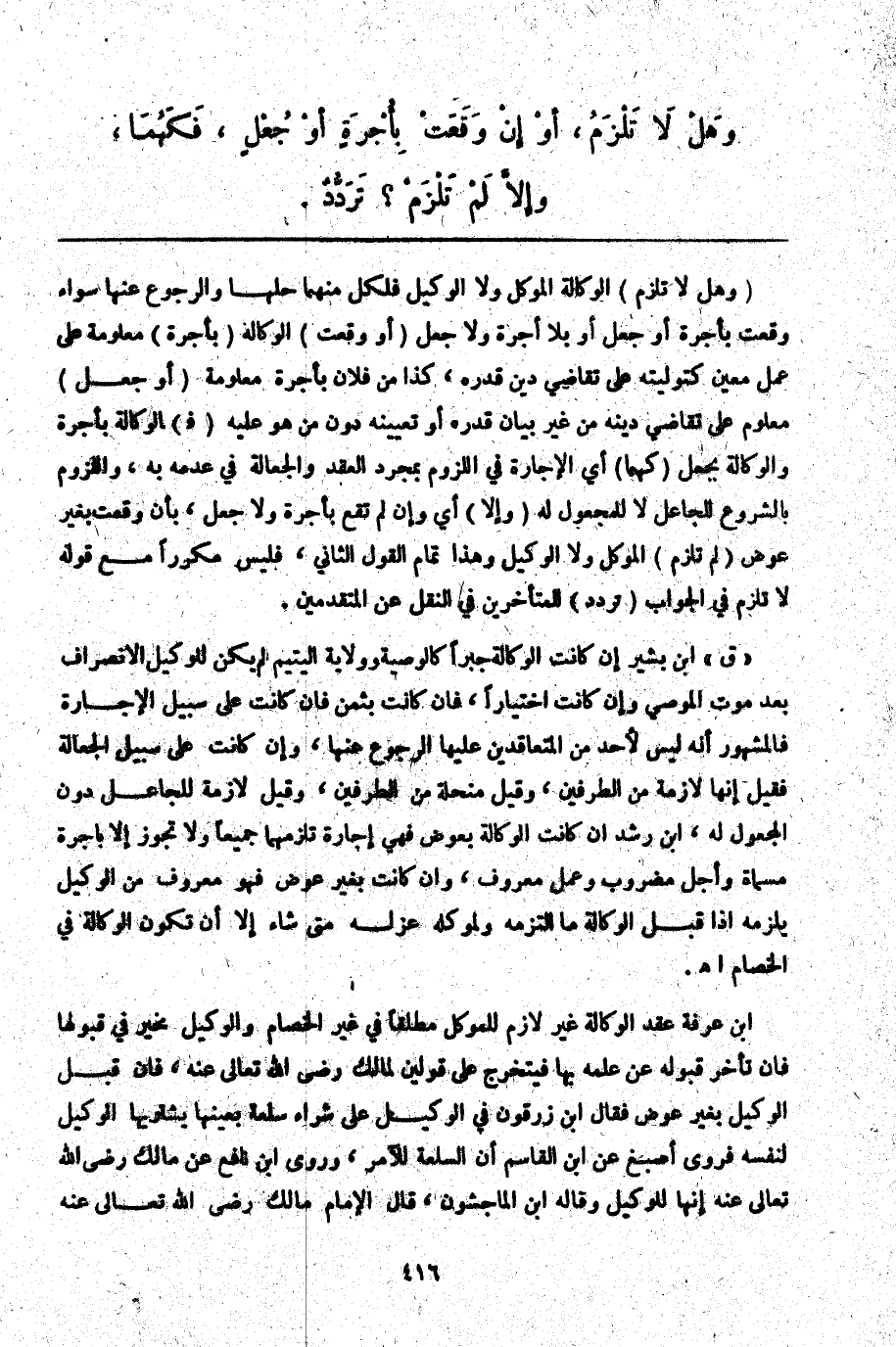 ـــــــــــــــــــــــــــــQ (وَهَلْ لَا تَلْزَمُ) الْوَكَالَةُ الْمُوَكِّلَ وَلَا الْوَكِيلَ فَلِكُلٍّ مِنْهُمَا حَلُّهَا وَالرُّجُوعُ عَنْهَا سَوَاءٌ وَقَعَتْ بِأُجْرَةِ أَوْ جُعْلٍ أَوْ بِلَا أُجْرَةٍ وَلَا جُعْلٍ (أَوْ وَقَعَتْ) الْوَكَالَةُ (بِأُجْرَةٍ) مَعْلُومَةٍ عَلَى عَمَلٍ مُعَيَّنٍ كَتَوْلِيَتِهِ عَلَى تَقَاضِي دَيْنٍ قَدَّرَهُ، كَذَا مِنْ فُلَانٍ بِأُجْرَةٍ مَعْلُومَةٍ (أَوْ جُعْلٍ) مَعْلُومٍ عَلَى تَقَاضِي دِينِهِ مِنْ غَيْرِ بَيَانِ قَدْرِهِ أَوْ تَعْيِينِهِ دُونَ مَنْ هُوَ عَلَيْهِ (ف) الْوَكَالَةُ بِأُجْرَةِ وَالْوَكَالَةُ بِجُعْلٍ (كَهُمَا) أَيْ الْإِجَارَةِ فِي اللُّزُومِ بِمُجَرَّدِ الْعَقْدِ وَالْجَعَالَةِ فِي عَدَمِهِ بِهِ، وَاللُّزُومُ بِالشُّرُوعِ لِلْجَاعِلِ لَا لِلْمَجْعُولِ لَهُ (وَإِلَّا) أَيْ وَإِنْ لَمْ تَقَعْ بِأُجْرَةٍ وَلَا جُعْلٍ، بِأَنْ وَقَعَتْ بِغَيْرِ عِوَضٍ (لَمْ تَلْزَمْ) الْمُوَكِّلَ وَلَا الْوَكِيلَ وَهَذَا تَمَامُ الْقَوْلِ الثَّانِي، فَلَيْسَ مُكَرَّرًا مَعَ قَوْلِهِ لَا تَلْزَمُ فِي الْجَوَابِ (تَرَدُّدٌ) لِلْمُتَأَخِّرِينَ فِي النَّقْلِ عَنْ الْمُتَقَدِّمِينَ.