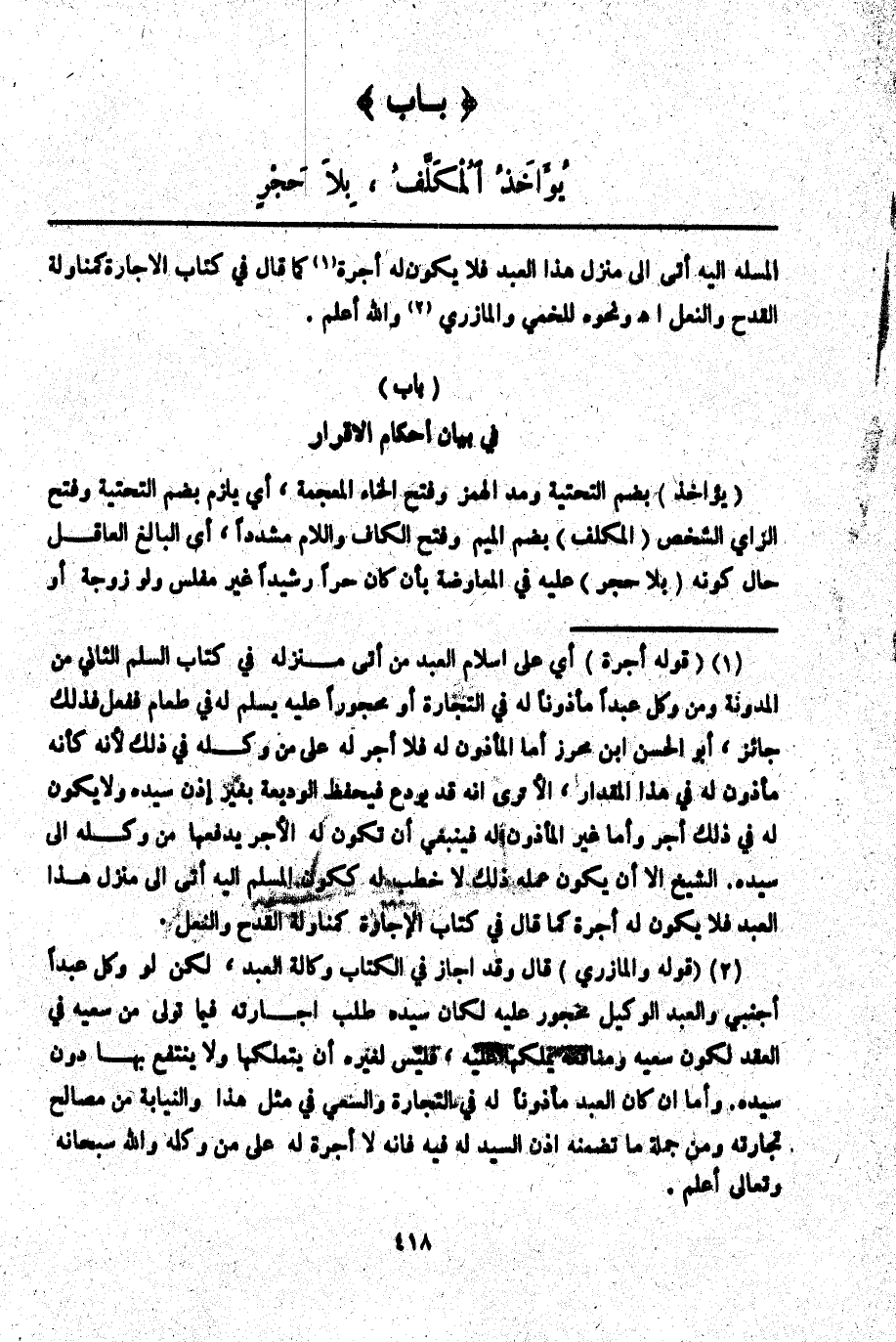 (بَابٌ) فِي بَيَانِ أَحْكَامِ الْإِقْرَارِ (يُؤَاخَذُ) بِضَمِّ التَّحْتِيَّةِ وَمَدِّ الْهَمْزِ وَفَتْحِ الْخَاءِ الْمُعْجَمَةِ، أَيْ يَلْزَمُ بِضَمِّ التَّحْتِيَّةِ وَفَتْحِ الزَّايِ الشَّخْصَ (الْمُكَلَّفَ) بِضَمِّ الْمِيمِ وَفَتْحِ الْكَافِ وَاللَّامِ مُشَدَّدًا، أَيْ الْبَالِغَ الْعَاقِلَ حَالَ كَوْنِهِ (بِلَا حَجْرٍ) عَلَيْهِ فِي الْمُعَاوَضَةِ بِأَنْ كَانَ حُرًّا رَشِيدًا غَيْرَ مُفْلِسٍ وَلَوْ زَوْجَةً أَوْ